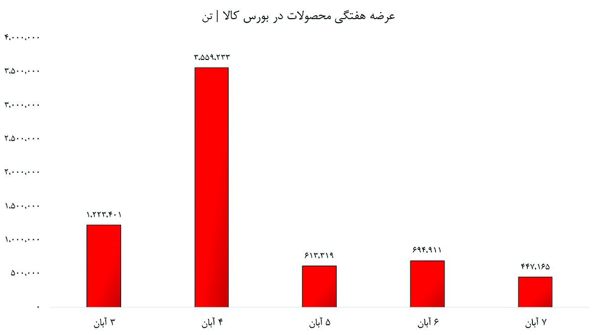 طی یک هفته اخیر بازار فرعی بورس‌کالا ۳۴‌هزارو۹۸تن، پتروپالایشی ۲۴۹‌هزارو۴۳۱تن، صنعتی یک‌میلیون و ۶۹‌هزار و ۷۰۵ تن، کالای صادراتی یک‌‌میلیون و ۲۷۲‌هزار و ۸۲۲ تن و بازار حراج ۲‌میلیون و ۵۹۶‌هزار و ۵۷۵ تن محصول عرضه کردند. بازار صنعتی در روز ۴آبان ماه و بازار کالای صادراتی ۵آبان ماه بیشترین میزان عرضه را تجربه کردند به‌طوری که تالار صنعتی ۶۳۲‌هزارو۱۰۵تن و تالار کالای صادراتی ۳۹۵‌هزارو ۴۹تن در آن روز عرضه محصول داشتند.