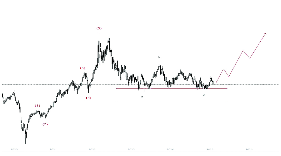 بررسی دقیق روند قیمت نفت نشان میدهد که حرکت صعودی بزرگ بازار از کف تاریخی سال۲۰۲۰ تا سقف ۱۳۰دلاری۲۰۲۲ بخش اصلی چرخهای پنجموجی بوده که اکنون وارد فاز اصلاح شده است.