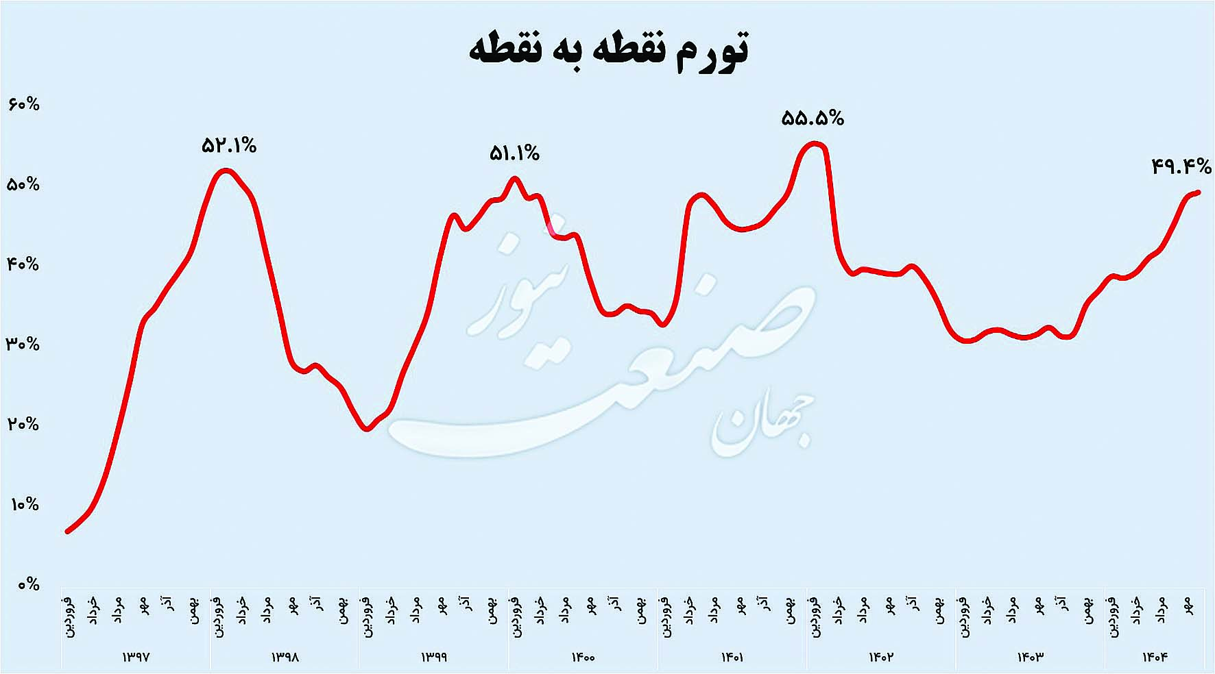 براساس این گزارش، تورم نقطه‌به‌نقطه در آبان امسال به ۴/۴۹‌درصد رسیده است؛ رقمی که نسبت به مهرماه ۸/۰‌واحد درصد افزایش یافته و بالاترین مقدار از اردیبهشت‌۱۴۰۲ محسوب می‌شود. با این روند، احتمالا پاییز با ثبت تورم ۵۰‌درصدی به پایان خواهد رسید و اقتصاد ایران برای چهارمین بار از سال‌۱۳۹۸ تورم بالای ۵۰‌درصد را تجربه می‌کند؛ رخدادی کم‌سابقه در چند دهه اخیر که نشان‌دهنده شدت و پایداری فشارهای تورمی است.