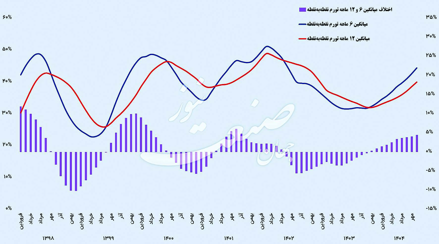 در آبان‌ماه ۱۴۰۴، میانگین شش‌ماهه تورم نقطه‌به‌نقطه به ۴/۴۴‌درصد رسیده است. میانگین ۱۲‌ماهه تورم نقطه‌به‌نقطه نیز ۹/۳۹‌درصد بوده است. اختلاف این دو شاخص (میانگین تورم نقطه‌به‌نقطه در بازه ۶ و ۱۲ ماهه) اکنون ۴/۴‌واحد درصد است که نسبت به مهرماه افزایش یافته است. افزایش فاصله میانگین تورم کوتاه‌مدت و میان‌مدت نشان می‌دهد شدت موج تورمی کاهش پیدا نکرده و فشارهای تورمی در حال انباشت است. در تحلیل‌های اقتصاد کلان، هرگاه میانگین کوتاه‌مدت تورم از میانگین بلندتر بیشتر باشد و فاصله دو شاخص بزرگ شود، نشانه‌ای از افزایش سرعت رشد قیمت‌ها و تشدید فشارهای تورمی است. با توجه به این روند، سناریوی افزایش تورم در ماه‌های پایانی سال، سناریوی غالب و محتمل است.