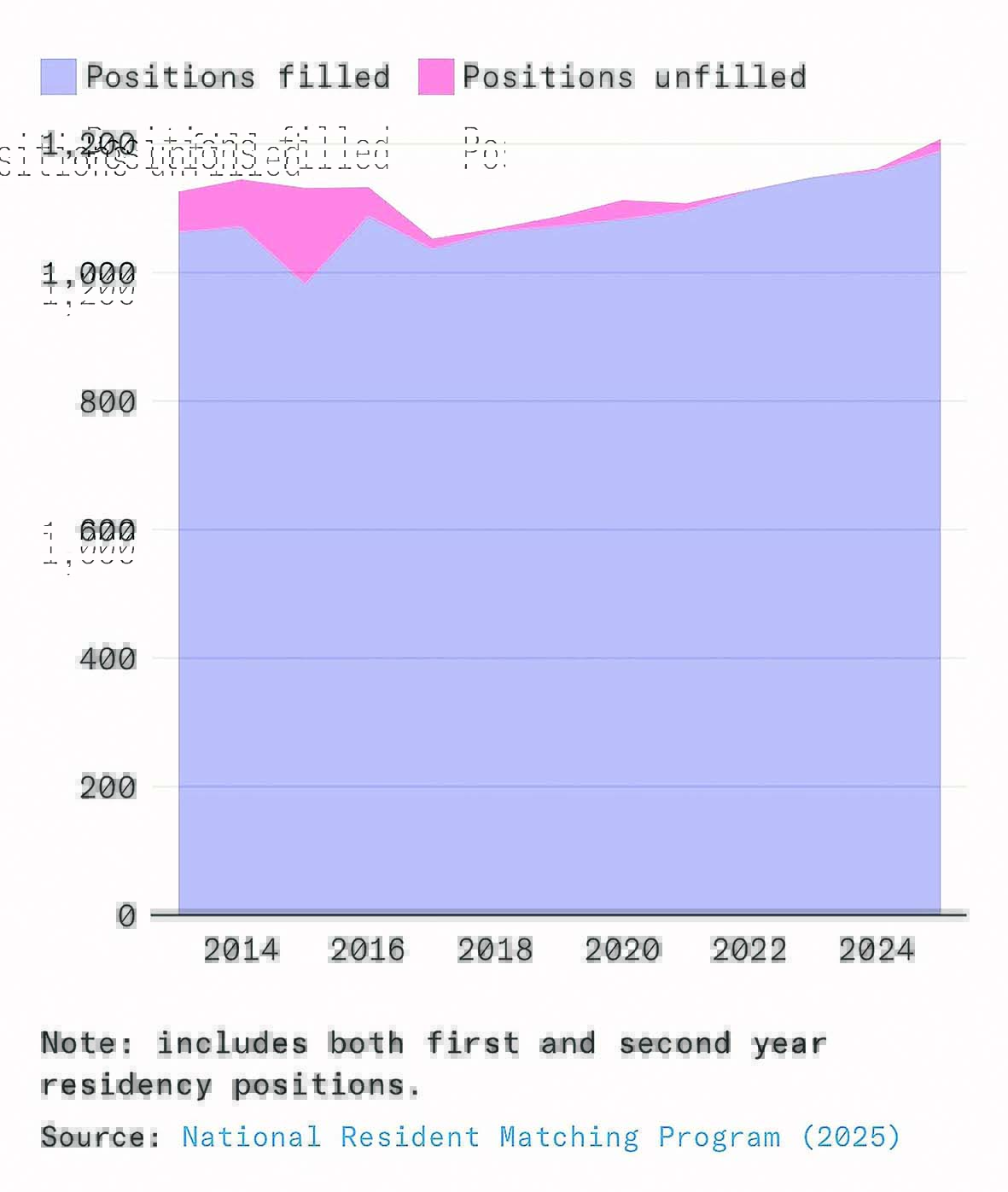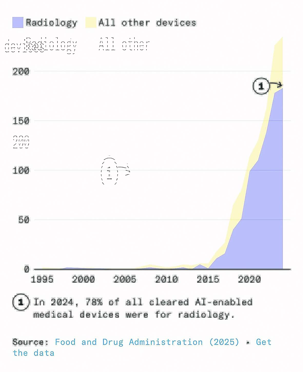 رادیولوژی حوزهای است که برای جایگزینی نیروی انسانی بهینهسازی شده است؛ جایی که ورودیهای دیجیتال، وظایف مبتنی بر تشخیص الگو و شاخصهای روشن غالب هستند. در سال ۲۰۱۶، جفری هینتون، دانشمند رایانه و برنده جایزه تورینگ اعلام کرد که «از همین حالا باید آموزش رادیولوژیستها را متوقف کرد.» اگر افراطیترین پیشبینیها درباره اثر هوش مصنوعی بر اشتغال و دستمزدها درست بود، آنگاه رادیولوژی باید مانند قناری در معدن زغالسنگ عمل میکرد و اولین نشانههای خطر را نشان میداد اما تقاضا برای نیروی انسانی بیش از هر زمان دیگری است. در سال ۲۰۲۵، برنامههای رزیدنتی رادیولوژی تشخیصی آمریکا رکورد ۱۲۰۸ موقعیت رزیدنتی را در تمام تخصصهای رادیولوژی ارائه دادند؛ افزایشی ۴درصدی نسبت به سال ۲۰۲۴. نرخ خالی بودن جایگاهها در این حوزه نیز به بالاترین سطح تاریخ خود رسیده است. در سال ۲۰۲۵، رادیولوژی دومین تخصص پردرآمد پزشکی در ایالات متحده بود، با درآمد متوسط ۵۲۰هزار دلار، یعنی بیش از ۴۸درصد بالاتر از میانگین سال ۲۰۱۵.