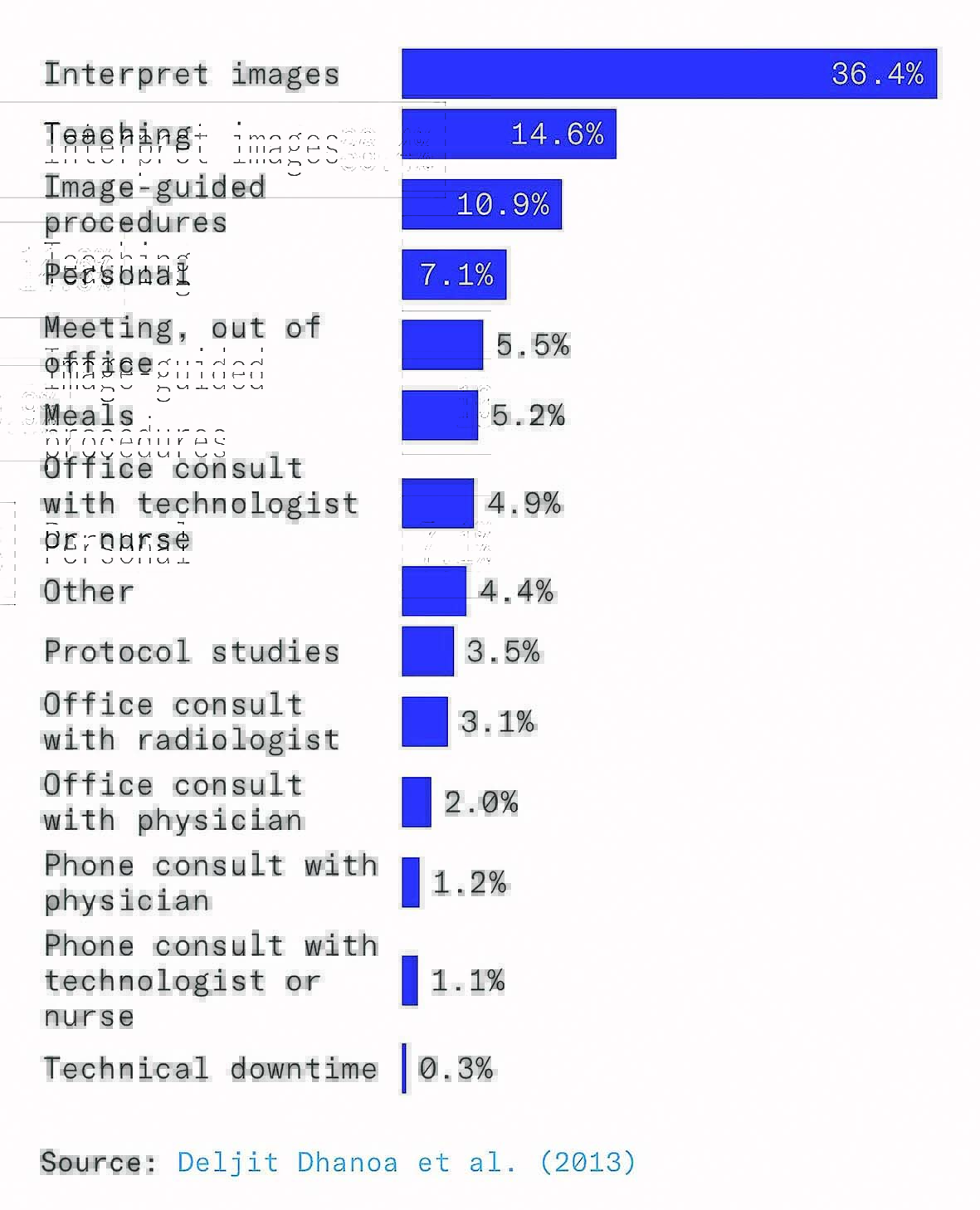 حتی اگر مدلهای هوش مصنوعی آنقدر دقیق شوند که اسکنها را بهتنهایی بخوانند، رادیولوژیستها ممکن است پرمشغلهتر از قبل شوند، نه بیکار. یک مطالعه در ۲۰۱۲ نشان داد که فقط ۳۶درصد از زمان رادیولوژیستها صرف تفسیر مستقیم تصاویر میشود. بخش عمده زمان صرف مواردی چون نظارت بر تصویربرداری، ارتباط با پزشکان و بیماران، آموزش دستیاران رادیولوژی و تکنولوژیستها و بازبینی درخواستها و پروتکلهای تصویربرداری میشود. بنابراین اگر هوش مصنوعی در تفسیر تصاویر بهتر شود، رادیولوژیستها زمان خود را به سمت وظایف دیگر جابهجا میکنند و اثر جایگزینی کاهش مییابد.