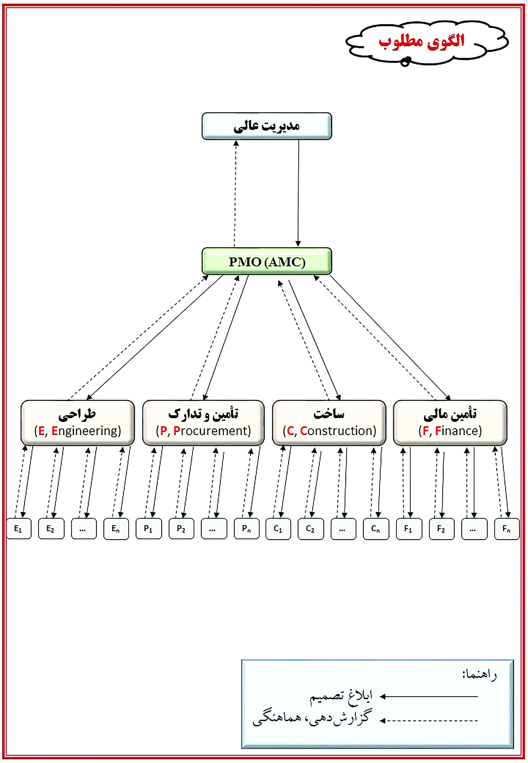 ۱- یکی از الگوهای مناسب، الگوی توزیع فعالیت‌ها با استفاده از رکن PMO یا AMC است که در شکل مربوطه آمده است (شکل مربوط به الگوی مطلوب).