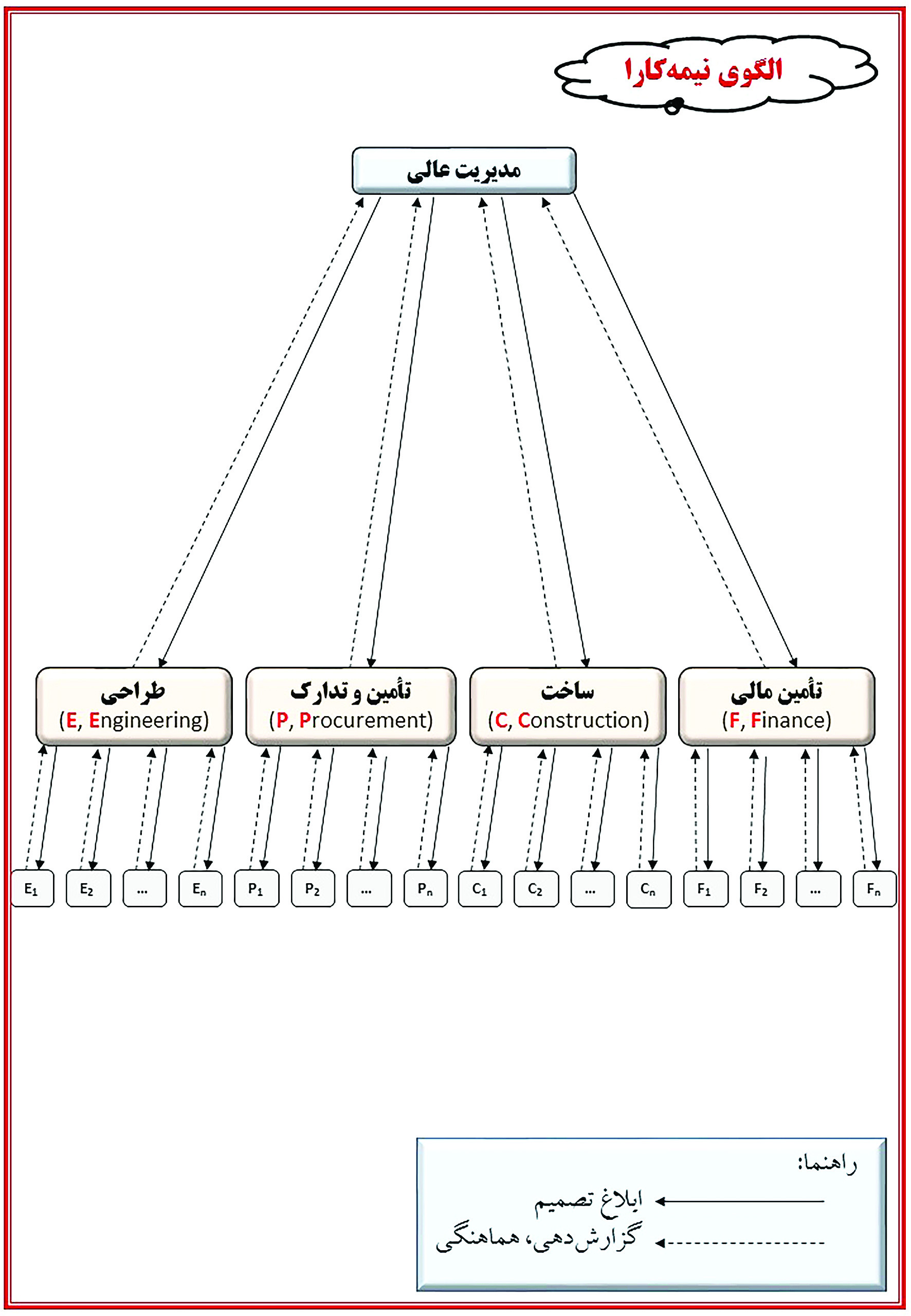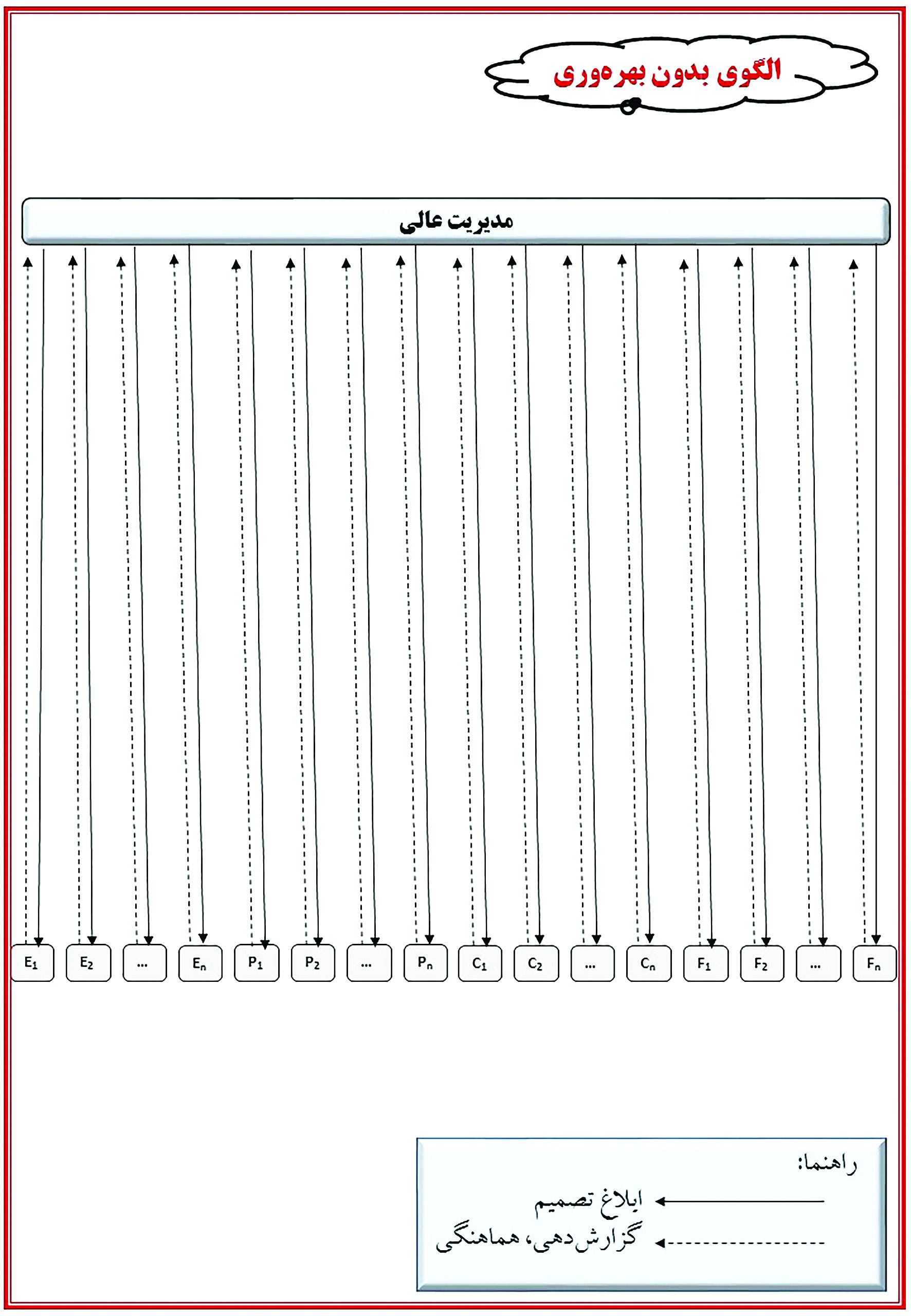 ۳- الگوی بدون بهره‌وری (طبق شکل مربوطه) باعث اتلاف منابع و درگیری شدید مدیران‌عالی از نظر هزینه و زمان می‌شود زیرا مستقیما با تمامی عوامل و ارکان همکاری خواهند کرد.