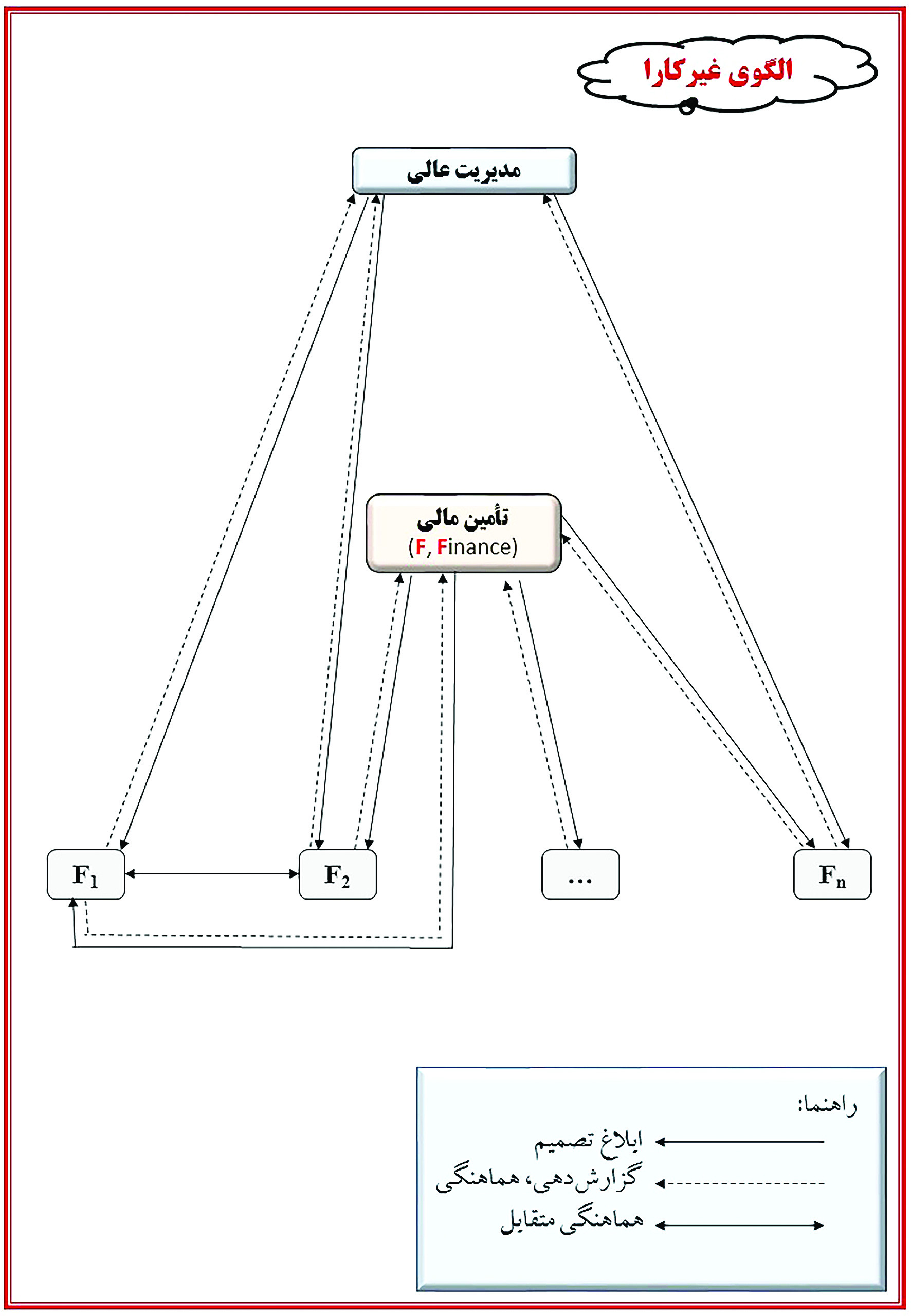 ۴- الگوی غیرکارا (شکل مربوطه) نیز به شدت موجب عدم کارایی می‌شود که به موجب آن، تشتت رفتاری و اجرایی را شامل بوده و هیچ نظمی در اجرا وجود نخواهد داشت که به نظر می‌رسد الگوی مورد استفاده در ایران، از این شکل تبعیت می‌کند. در اینجا یک رکن (تامین مالی) به عنوان نمونه آورده شده است و برای سایر ارکان نیز همین امر وجود دارد.