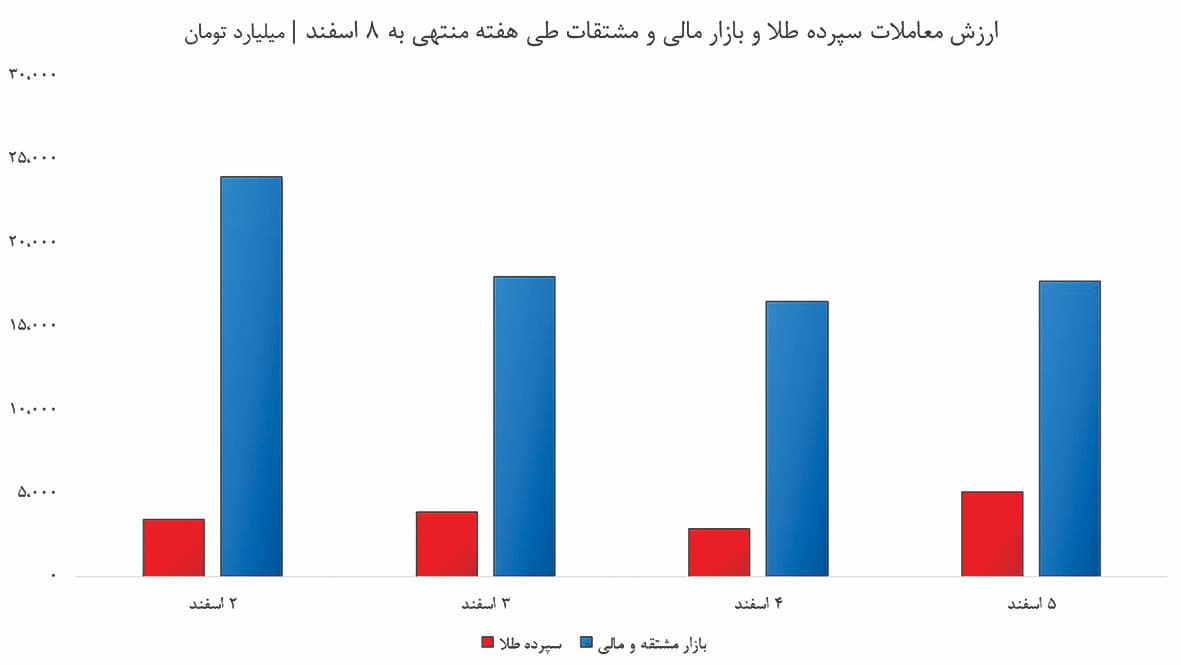 میانگین ارزش معاملات گواهی سپرده طلا در هفتهای که گذشت ۳هزارو۸۲۰میلیاردتومان برآورد میشود که در ۵اسفندماه به اوج خود در محدوده ۵هزارو۱۰۸میلیاردتومان رسید. در همین یک هفته بازار مشتقه و مالی ۱۹هزارو۶میلیاردتومان، گواهی زعفران ۱۰۳میلیاردتومان و گواهی شمش نقره ۸۱۹میلیاردتومان به طور میانگین ارزش معاملات داشتند.با یک مقایسه ساده میتوان متوجه شد که بازار مشتقه و مالی با میانگین ارزش معاملات ۱۹هزارو۶میلیاردتومانی در یک هفته حجم و قدرت بیشتری نسبت به گواهی سپرده طلا، نقره و زعفران دارد. بازار مشتقه و مالی در ۲اسفندماه بیشترین میزان ارزش معاملات را در محدوده ۲۳هزارو۹۵۳میلیاردتومان تجربه کرده است.