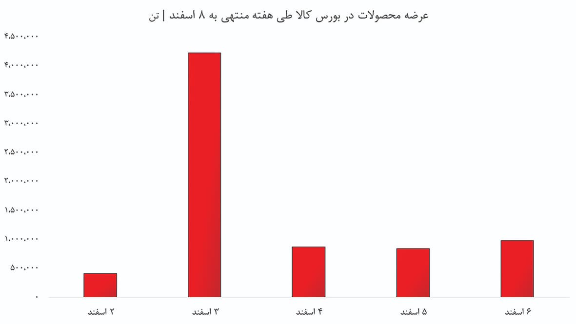 به طوری که در این روز به میزان قابلتوجه ۴میلیونو۲۲۱هزارو۶۹۰تن محصول عرضه شد اما در روز دوم اسفند محصولات تولیدی کمترین میزان عرضه را تجربه کرده بودند و با عرضه ۴۱۶هزارو۷۴ تن روز کم رمقی را برای بورس کالا رقم زدند.