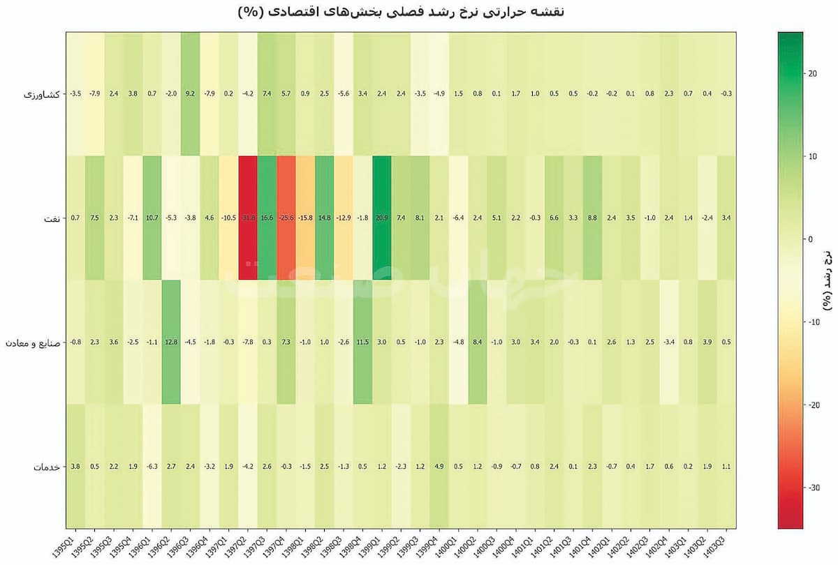 در این میان نقش نفت در تعیین مسیر کل اقتصاد کاملا مشهود است. این بخش در سال‌های۱۳۹۵ و ۱۳۹۶ با رشدهای دورقمی همراه بود(اوج آن ۷/‏۱۰‌درصد در بهار۱۳۹۶) که به رشد عمومی اقتصاد شتاب بخشید اما از سال۱۳۹۷، همزمان با بازگشت تحریم‌های نفتی، رشد این بخش به‌شدت منفی شد و در تابستان۱۳۹۷ به منفی ۳۱‌درصد سقوط کرد؛ رخدادی که به‌تنهایی موجب افت رشد کل اقتصاد به منفی ۸‌درصد شد. در سال‌های بعد با سازوکارهای جدید فروش نفت، بخشی از این کاهش جبران شد و رشد نفت در سال۱۴۰۱ به حدود ۸/۸‌درصد رسید اما از سال۱۴۰۲ به بعد مجدد در سطحی پایین، میان ۲ تا ۳‌درصد نوسان دارد.