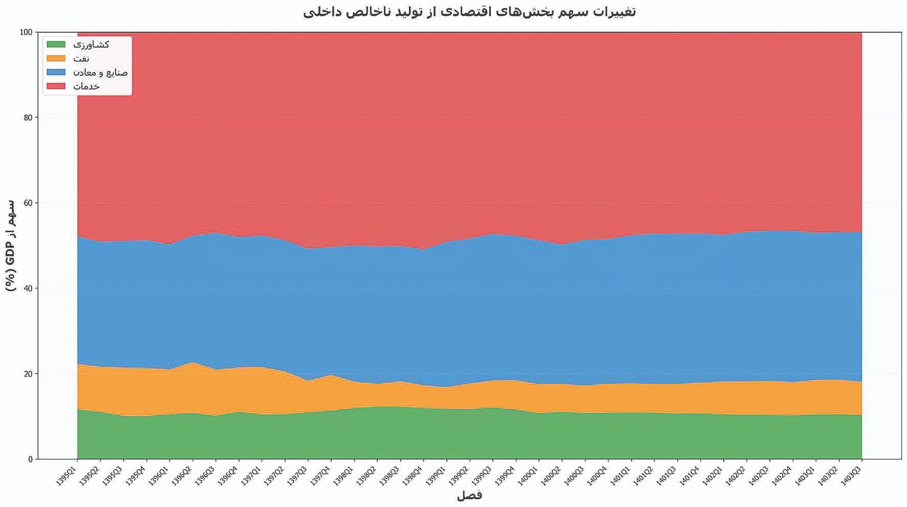 در نهایت بخش کشاورزی که سهمی حدود ۱۰‌درصد در تولید دارد، نوسانات جزئی ولی مداوم را ثبت کرده است. رشد آن اغلب بین منفی۲ تا مثبت۳‌درصد در گردش بوده و به‌شدت تحت‌تاثیر شرایط آب‌و‌هوا، محدودیت منابع و الگوی کشت سنتی قرار دارد.