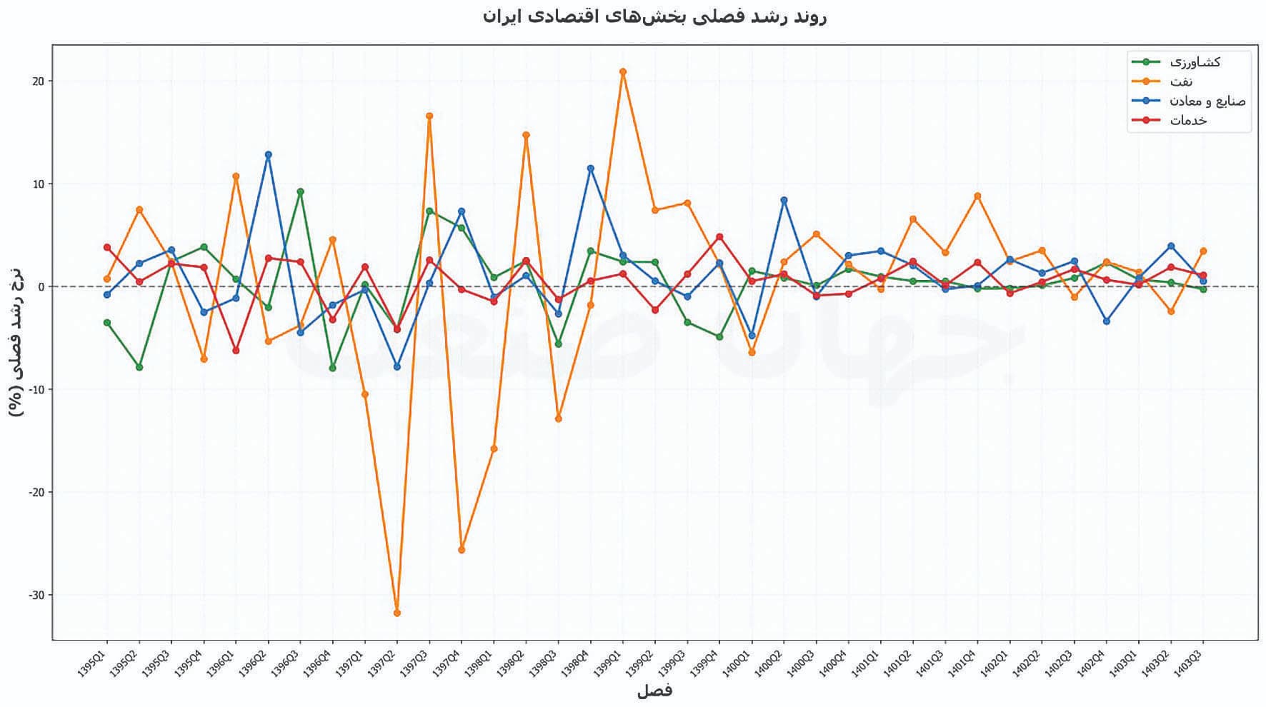 مرور داده‌های رشد فصلی اقتصاد ایران از سال۱۳۹۵ تا ۱۴۰۳ تصویری از یک حرکت ناپایدار و پرنوسان را به‌دست می‌دهد؛ حرکتی که هرچند در مقاطعی به رشد مثبت رسیده اما در مجموع حاصل آن رشد اندک و شکننده‌ای است که تداوم نیافته است. رشد تولید ناخالص داخلی ایران در این بازه، از ۲/‏۱‌درصد در بهار۱۳۹۵ آغاز شد، در تابستان۱۳۹۶ به اوج ۲۶/‏۴‌درصدی رسید و در پی تحریم‌های شدید سال۱۳۹۷ سقوطی کم‌سابقه را تجربه کرد به‌طوری‌که در تابستان همان سال رشد کل اقتصاد به منفی ۸‌درصد رسید. از آن پس، اقتصاد هرچند از رکود عمیق خارج شد اما هیچ‌گاه به سطح رشد پایدار بالای ۳‌درصد بازنگشت.