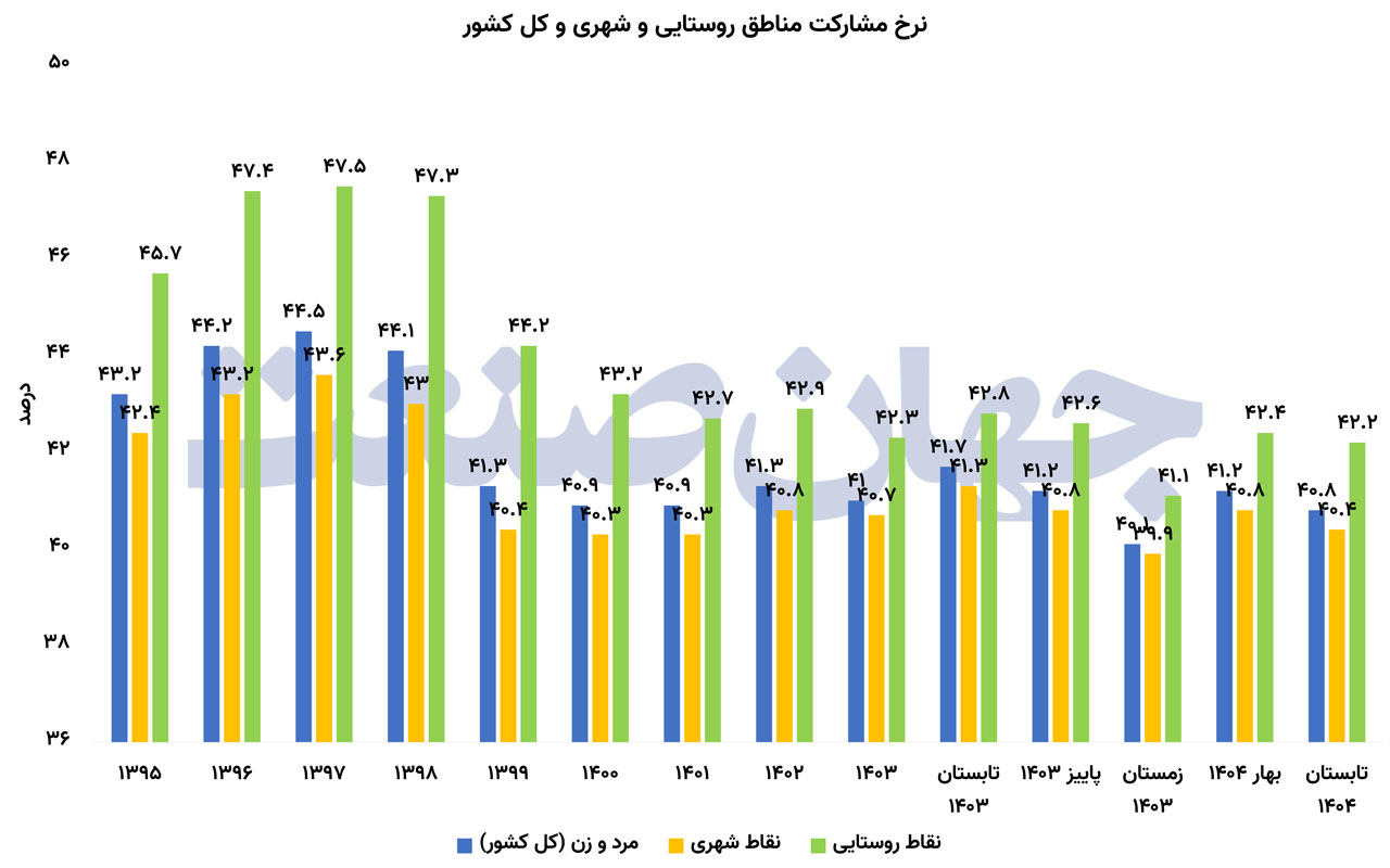 اگر نرخ بیکاری را «سطح آب» بازار کار بدانیم نرخ مشارکت اقتصادی «عمق» آن است. پاییز۱۴۰۴ نشان میدهد عمق بازار کار درحال کمشدن است. نرخ مشارکت اقتصادی جمعیت ۱۵ساله و بیشتر به۷/۴۰درصد رسیده؛ رقمی که نسبتبه پاییز۱۴۰۳ حدود ۵/۰واحددرصد کاهش یافته است. اینافت شاید در ظاهر کوچک باشد اما درمقیاس جمعیتی ایران معنای بزرگی دارد. جمعیت فعال کشور در پاییز۱۴۰۳ معادل ۲۶میلیونو۹۳۵هزارنفر بود. اینعدد در تابستان۱۴۰۴ به۲۶میلیونو۹۳۸هزارنفر رسید اما همزمان جمعیت کل ۱۵ساله و بیشتر افزایش یافته است. درمقابل جمعیت غیرفعال شامل دانشآموزان، دانشجویان، خانهداران، بازنشستگان و افرادی که از جستوجوی کار منصرف شدند به۳۹میلیونو۳۰۰هزارنفر رسیده یعنی افزایشی حدود ۸۰۰هزارنفر نسبتبه پاییز سال قبل. اینروند زمانی معنادارتر میشود که بهعقب برگردیم. نرخ مشارکت اقتصادی از ۵/۴۴درصد در سال۱۳۹۷ به۳/۴۱درصد در۱۳۹۹ سقوط کرد یعنی افتی سهواحدی که عمدتا تحت تاثیر رکود کرونایی رخ داد. پس از آن ایننرخ در محدوده ۴۰تا۴۱درصد تثبیت شد: ۹/۴۰درصد در۱۴۰۰، ۹/۴۰درصد در۱۴۰۱، ۳/۴۱درصد در۱۴۰۲ و ۴۱درصد در۱۴۰۳. اکنون با ثبت ۷/۴۰درصد در پاییز۱۴۰۴ بازار کار باردیگر بهمرزهای پایین مشارکت نزدیک شده است. کاهش مشارکت زمانی نگرانکنندهتر میشود که بدانیم نرخ بیکاری همزمان درحال افزایش است. در بسیاری از سالهای گذشته کاهش بیکاری با افت مشارکت همراه بوده یعنی بخشی از بهبود ظاهری بازار کار ناشی از خروج افراد از جمعیت فعال بود اما اکنون ترکیب تازهای شکل گرفته: هم بیکاری بالا رفته و هم مشارکت پایین آمده است. اینوضعیت میتواند نشانهای از