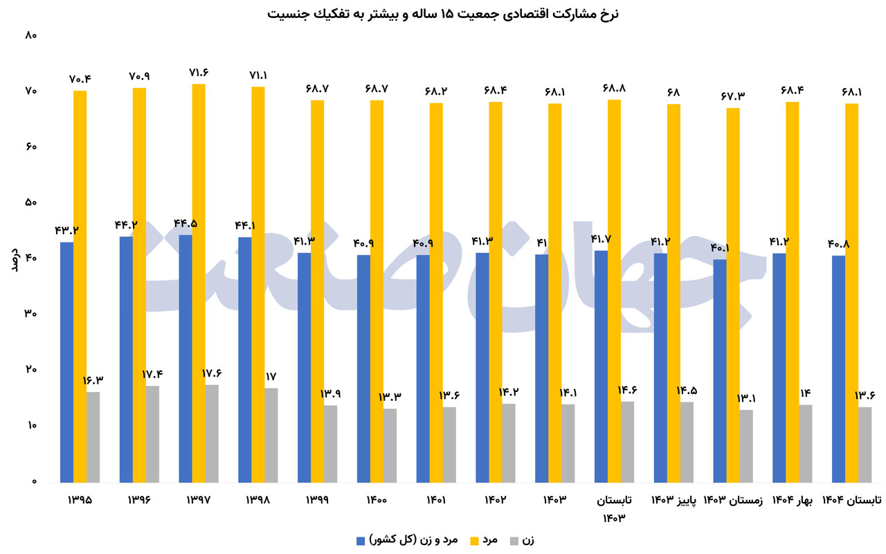 درمیان تمام اعداد بازار کار شاید هیچ شکافی بهاندازه فاصله مشارکت زنان و مردان پایدار و ساختاری نباشد. در پاییز۱۴۰۴ نرخ مشارکت اقتصادی کل کشور به۷/۴۰درصد رسیده اما اینعدد میان دو واقعیت کاملا متفاوت تقسیم شده است: مشارکت مردان در محدوده ۶۸درصد و مشارکت زنان در حوالی ۱۴درصد. بهبیان دیگر از هر ۱۰مرد در سن کار حدود هفتنفر در بازار کار حضور دارند اما از هر ۱۰زن تنها یکتادونفر فعال اقتصادی محسوب میشوند. نگاهی بهروند بلندمدت نشان میدهد اینشکاف نهتنها کوچک نشده بلکه در سالهای اخیر تثبیت شده است. نرخ مشارکت زنان از ۳/۱۶درصد در سال۱۳۹۵ به۶/۱۷درصد در۱۳۹۷ رسید اما پس از شوک سال۱۳۹۹ به۹/۱۳درصد سقوط کرد و در سال۱۴۰۰ حتی به۳/۱۳درصد کاهش یافت. در سالهای۱۴۰۱و۱۴۰۲ ایننرخ بهترتیب ۶/۱۳و۲/۱۴درصد ثبت شد و در سال۱۴۰۳ نیز ۱/۱۴درصد بود. اکنون در فصلهای اخیر۱۴۰۴ اینشاخص همچنان در همان کانال۱۳تا۱۴درصد نوسان میکند آنهم بدون نشانهای از جهش معنادار. درمقابل نرخ مشارکت مردان طی همین سالها عمدتا بین ۶۸تا۷۱درصد در حرکت بوده است: ۴/۷۰درصد در۱۳۹۵، ۶/۷۱درصد در۱۳۹۷، ۷/۶۸درصد در۱۳۹۹، ۴/۶۸درصد در۱۴۰۲ و ۱/۶۸درصد در۱۴۰۳. اینثبات نسبی نشان میدهد بار تعدیلهای بازار کار عمدتا بر دوش زنان قرار گرفته است. شکاف جنسیتی در نرخ بیکاری نیز قابلتوجه است. در سال۱۴۰۳ نرخ بیکاری مردان ۲/۶درصد و زنان ۳/۱۴درصد بوده است یعنی بیش از دوبرابر. ایننسبت در سالهای قبل نیز تکرار شده برای مثال در۱۴۰۲ بیکاری مردان ۶/۶درصد و زنان ۱۵درصد بوده است. مجموع اینارقام نشان میدهد مساله اشتغال زنان در ایران نه یکنوسان فصلی بلکه یکچالش ساختاری و ماندگار است. وقتی مشارکت زنان در محدوده ۱۴درصد تثبیت میشود بهمعنای آن است که بخش بزرگی از ظرفیت نیروی انسانی کشور اساسا وارد چرخه تولید و اشتغال نمیشود. بازار کار پاییز۱۴۰۴ درکنار افزایش بیکاری و افت مشارکت یکپیام روشن دیگر هم دارد: شکاف جنسیتی همچنان عمیق و حلنشده باقی مانده است.