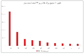 ارزش خالص دارایی (NAV) صندوقهای طلا جمعا به۵۳۲هزارو۸۳۱میلیاردتومان رسیده است که با ارزش معاملات ۲هزارو۳۳۰میلیاردتومانی نسبت ارزشبهتراکنش (NVT) کل گروه ۲۲۹ واحد برآورد میشود. صندوقهای طلا نسبتبه صندوقهای درآمد ثابت نقدشوندگی کمتری داشته و تحت فشار بیشتری هستند چراکه میانگین نسبت ارزش بهتراکنش در گروه فیکس اینکام کمتر از ۵۰واحد بوده درحالیکه گروه صندوقهای طلا به۲۲۹واحد رسیده است. صندوق عیار ۲۱۷هزارو۱۸۳میلیاردتومان، طلای لوتوس ۸۷هزارو۶۷۳میلیاردتومان، کهربا ۴۲هزارو۹۵۹میلیاردتومان، مثقال ۳۵هزارو۵۲۶میلیاردتومان، گنج ۳۰هزارو۶۳۹میلیاردتومان، گوهر ۲۰هزارو۵۰۴میلیاردتومان، جواره ۱۶هزارو۸۵۳میلیاردتومان، تابش ۱۴هزارو۷۵۲میلیاردتومان، زر ۱۲هزارو۵۰۴میلیاردتومان و ناب ۱۲هزارو۴۸میلیاردتومان ارزش خالص دارایی دارند که ۱۰صندوق بزرگ طلا در بازار سرمایه شناخته میشوند. ارزش معاملات روزانه صندوق عیار ۵۵۵میلیاردتومان، طلای لوتوس ۱۴۲میلیاردتومان، کهربا ۱۵۷میلیاردتومان، مثقال ۱۳۶میلیاردتومان، گنج ۹۴میلیاردتومان، گوهر ۱۷میلیاردتومان، جواهر ۵۱میلیاردتومان، تابش ۷۸میلیاردتومان، زر ۱۳میلیاردتومان و ناب ۲۴۲میلیاردتومان بهثبت رسیده است.