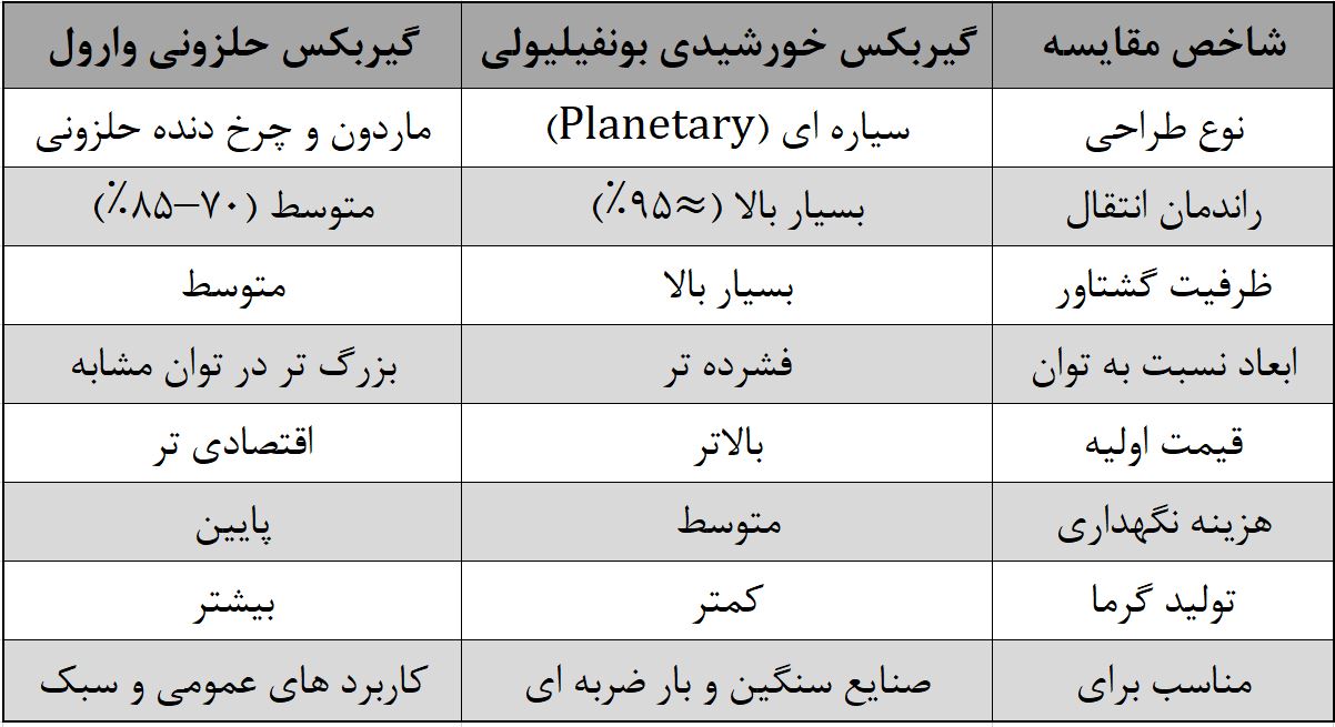 مقایسه میان گیربکس خورشیدی بونفیلیولی و گیربکس حلزونی وارول نشان می دهد که هیچ گزینه ای ذاتاً بر دیگری برتری مطلق ندارد. انتخاب درست زمانی سودآور خواهد بود که: