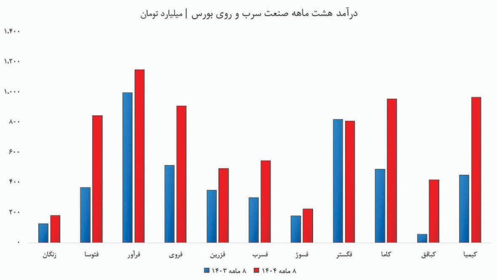 در هشتماهه نخست۱۴۰۴، شرکت باما ۹۵۵میلیارد تومان، کالسیمین ۶۲۴۱میلیارد تومان، معادن بافق ۴۱۹میلیاردتومان، فرآوری موادمعدنی ۱۱۴۸میلیارد تومان، ملی سرب و روی ایران ۵۴۳میلیارد تومان، زرینمعدن آسیا ۴۹۳میلیارد تومان، سوژمیران ۲۲۵میلیارد تومان، ذوب روی اصفهان ۹۰۸میلیارد تومان، معدنی کیمیای زنجان گستران ۹۶۵میلیارد تومان، گسترش صنایع روی ایرانیان ۸۰۷میلیارد تومان، تولید و توسعه سرب روی ایرانیان ۸۴۴میلیارد تومان و صنعت روی زنگان ۱۸۰میلیارد تومان فروش را به ثبت رساندند.