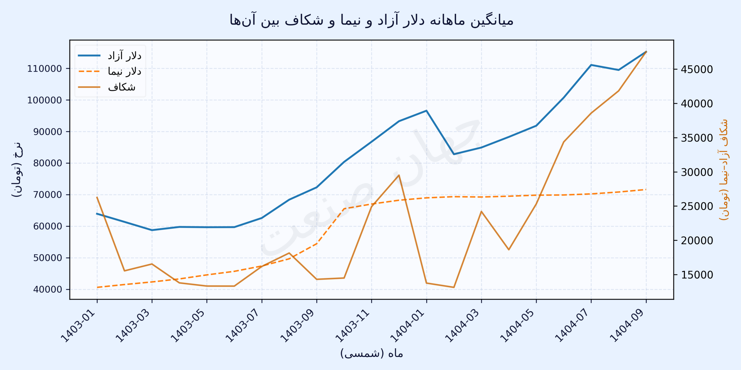 بازار ارز در دو سال اخیر بیش از همیشه دوگانه «نیمایی-آزاد» را به‌عنوان تصویر واقعی اقتصاد ایران نمایان کرده است. دلار نیمایی، نرخ اداری با عرضه کنترل‌شده، عملا نقش لنگر اسمی را بر عهده دارد اما دلار آزاد منعکس‌کننده انتظارات تورمی و ریسک ژئوپلیتیک است. همین تفاوت باعث شد شکاف میان دو نرخ در ۱۴۰۴ به بزرگ‌ترین سطح تاریخی برسد. در سال۱۴۰۳ این شکاف در محدوده ۲۰ تا ۲۵‌هزار تومان نوسان داشت و تنها با آغاز جنگ غزه در مهر به مرز ۳۰‌هزار تومان رسید اما سال۱۴۰۴ ورق را برگرداند. فروردین امسال دلار آزاد با میانگین ۹۶‌هزار و ۵۸۰تومان و نیمایی با ۸۲‌هزار و ۷۹۰تومان بسته شد؛ فاصله‌ای که با وجود ظاهر محدود، روندی متفاوت را آغاز کرد. دلار آزاد طی چند روز از ۹۰به ۹۸‌هزار تومان رسید در حالی که نیما تقریبا ثابت ماند. اردیبهشت و خرداد نیز همین الگو ادامه یافت و فاصله رفتاری دو نرخ را بیشتر کرد. تابستان نقطه تقویت این شکاف بود. آزاد بین ۸۸تا ۹۳‌هزار تومان نوسان داشت اما نیما همچنان در محدوده ۸۳تا ۸۵‌هزار تومان حرکت می‌کرد. همین ناهمزمانی پاییز را به فصل جهش تبدیل کرد. مهر با میانگین ۱۱۴‌هزار و ۵۸۰تومان و آبان با ۱۱۸‌هزار و ۲۷۰ تومان بسته شد در حالی که نیما تنها چند‌هزار تومان افزایش یافت. اوج شکاف در آذر شکل گرفت: دلار آزاد در محدوده ۱۲۰‌هزار تومان و نیما حدود ۹۲‌هزار تومان باقی ماند؛ فاصله‌ای بیش از ۷۵‌هزار تومان؛بزرگ‌ترین شکاف ثبت‌شده دو سال اخیر. این واگرایی نشان می‌دهد که نرخ نیما دیگر توانایی مهار انتظارات بازار را ندارد و دلار آزاد عملا به معیار اصلی قیمت‌گذاری و پیش‌نگری تورم تبدیل شده است.