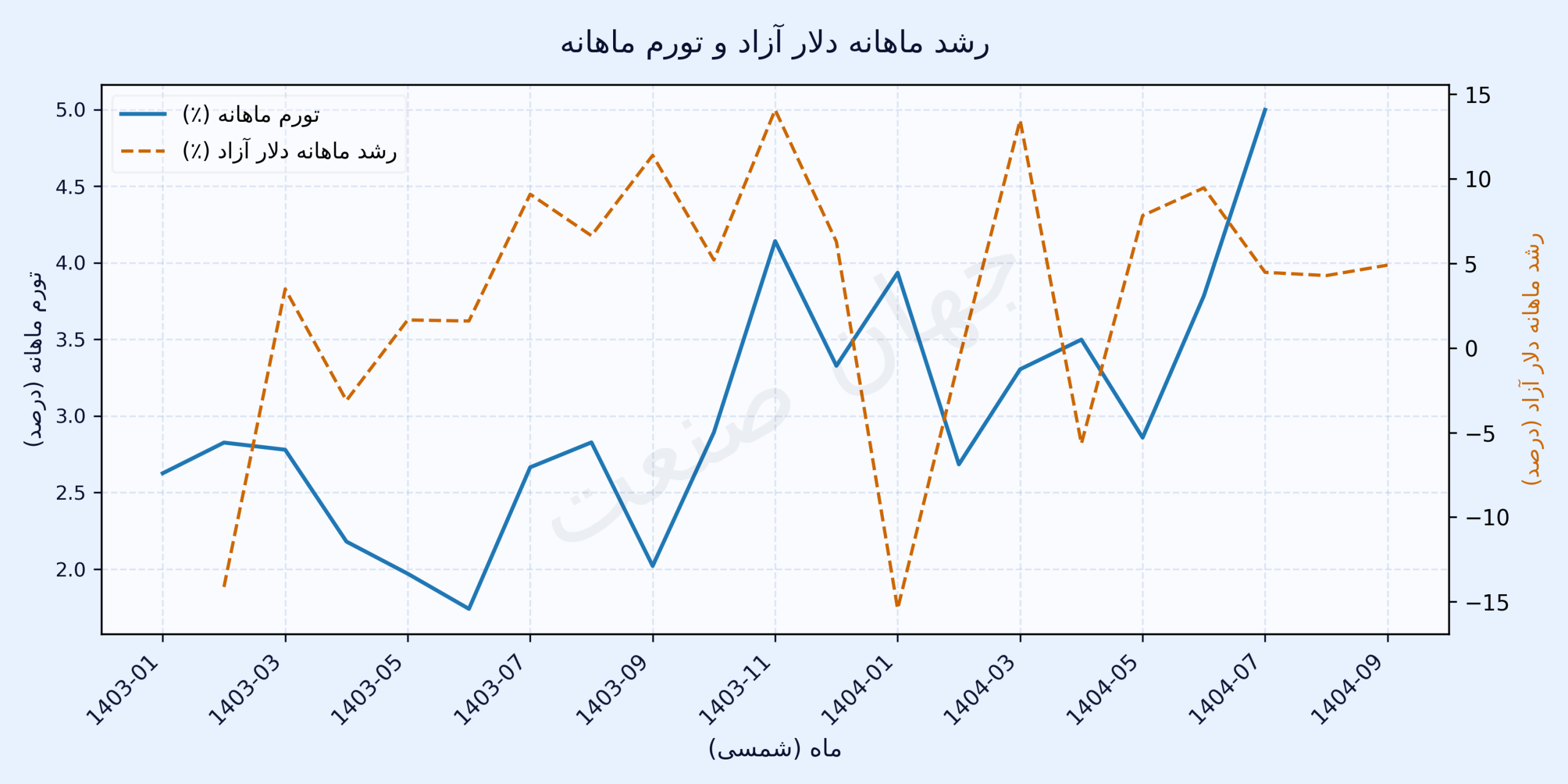 رابطه دلار و تورم در اقتصاد ایران همواره پررنگ بوده است اما داده‌های ماهانه۱۴۰۳ و ۱۴۰۴ نشان می‌دهد این رابطه در سال جاری نه‌فقط تقویت شده بلکه به سطح «هم‌قدمی ساختاری» رسیده است؛ وضعیتی که در آن دلار آزاد عملا به شاخص پیش‌نگر تورم ماهانه تبدیل شده است. همبستگی میان رشد ماهانه دلار آزاد و تورم ماهانه در این دوره حدود عدد ۰/‏۴۱ ثبت شده؛ عددی که نشان می‌دهد تغییرات نرخ ارز تقریبا همزمان در قیمت مصرف‌کننده منعکس شده است. اگر روند سال گذشته را مرور کنیم، تصویر روشن‌تر می‌شود. در مهر۱۴۰۳، میانگین دلار آزاد ۶۲‌هزار و ۵۷۰ تومان و تورم ماهانه در حدود ۲‌درصد بود اما با جهش نرخ به ۶۸‌هزار و ۳۹۰ تومان در آبان، تورم نیز تقریبا یک واحد‌درصد بالا رفت و به محدوده ۳‌درصد رسید. آذر۱۴۰۳ همزمان با میانگین ۷۲‌هزار و ۲۹۰تومان برای دلار آزاد، تورم نقطه‌به‌نقطه را تا سطح ۳۲‌درصد بالا برد. این هم‌حرکتی، شالوده رفتاری بود که در ۱۴۰۴ شدت بیشتری پیدا کرد. در سال۱۴۰۴ این روند ساختاری‌تر شد. فروردین امسال که میانگین دلار آزاد به ۹۶‌هزار و ۵۸۰تومان رسید- افزایشی بیش از ۵۰‌درصد نسبت به سال قبل- تورم ماهانه در سطح ۲/‏۶‌درصد تثبیت شد و تورم نقطه‌به‌نقطه در محدوده ۳۰تا۳۱‌درصد باقی ماند. اردیبهشت و خرداد نیز همین الگو را تکرار کردند: در خرداد که میانگین دلار ۸۶‌هزار و ۶۹۰تومان بود، تورم ماهانه ۲/‏۷‌درصد و تورم ۱۲‌ماهه ۳۶‌درصد ثبت شد، نشان می‌دهد که کاهش مقطعی نرخ دلار آزاد هنوز برای مهار تورم کافی نبود.