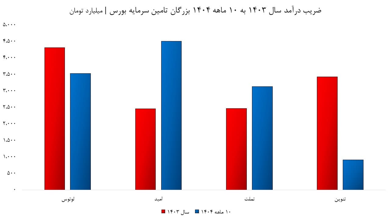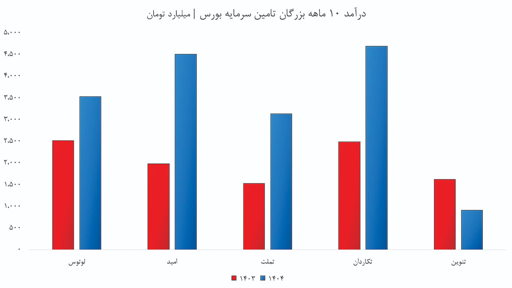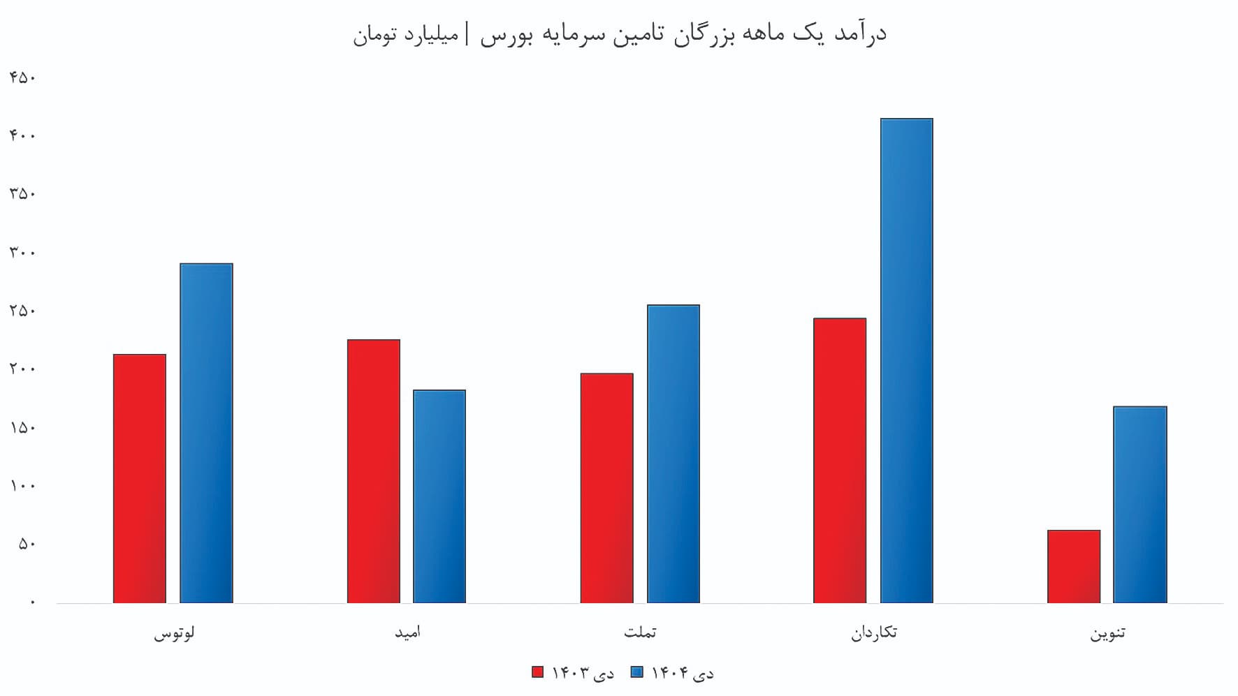 در دیماه۱۴۰۴ شرکت تامین سرمایه لوتوس پارسیان ۲۹۲میلیاردتومان، تامین سرمایه امید ۱۸۳میلیاردتومان، تامین سرمایه بانک ملت ۲۵۶میلیاردتومان، تامین سرمایه کاردان ۴۱۶میلیاردتومان و تامین سرمایه نوین ۱۶۹میلیاردتومان درآمد عملیاتی را به ثبت رساندند.