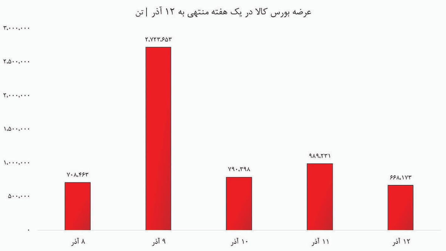 هادی بهرامی- بورس کالا در هفتهای که گذشت میزبان عرضه ۵میلیون و ۸۷۹هزار و ۹۱۸تن محصول مختلف شرکتها بود که نسبت به هفته قبل ۲۹هزار و ۱۳تن کمتر است اما از نظر ارزش معاملات نسبت به هفته نخست آذر، رشد نشان میدهد. روز ۹آذر، زمان طلایی عرضه این هفته به حساب میآید به طوری که در این روز به میزان ۲میلیون و ۷۲۳هزار و ۶۵۳تن محصول عرضه شد. در روز ۱۲آذرماه نیز محصولات تولیدی کمترین میزان عرضه را تجربه کردند و با عرضه ۶۶۸ هزار و ۱۷۳تنی محصول، روز کم رمقی را برای بورس کالا رقم زدند. در روز ۸آذر نیز به میزان ۷۰۸هزار و ۴۶۳تن، ۱۰آذر به میزان ۷۹۰هزار و ۳۹۸تن و ۱۱آذر به میزان ۹۸۹هزار و ۲۳۱تن محصول عرضه شد.