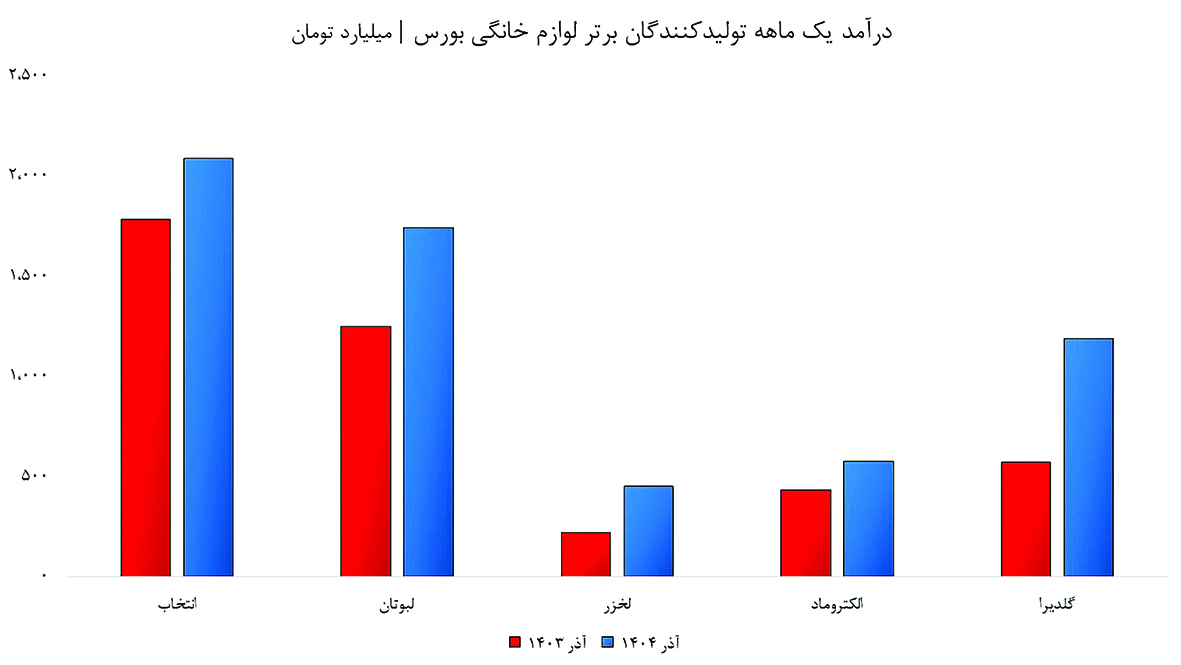 در مقابل گروه صنعتی بوتان، کمترین نرخ رشد یکماهه درآمدی را به ثبت رساند. جمع درآمدهای عملیاتی پنج لیدر صنعت لوازمخانگی بورس، جمعا از ۴هزار و ۶۴۹میلیارد تومان در آبانماه۱۴۰۴ با رشد خیرهکننده ۳۰درصدی به ۶هزار و ۴۴میلیارد تومان در آذر ماه ۱۴۰۴ رسیده است که نشان از عملکرد مطلوب رهبران لوازم خانگی بورس در یک ماه قبل دارد. در واقع تورم یکماهه منتهی به آذر ۲/۴درصد به ثبت رسید در حالی که نرخ رشد درآمد پنج شرکت نامبرده ۳۰درصد است.