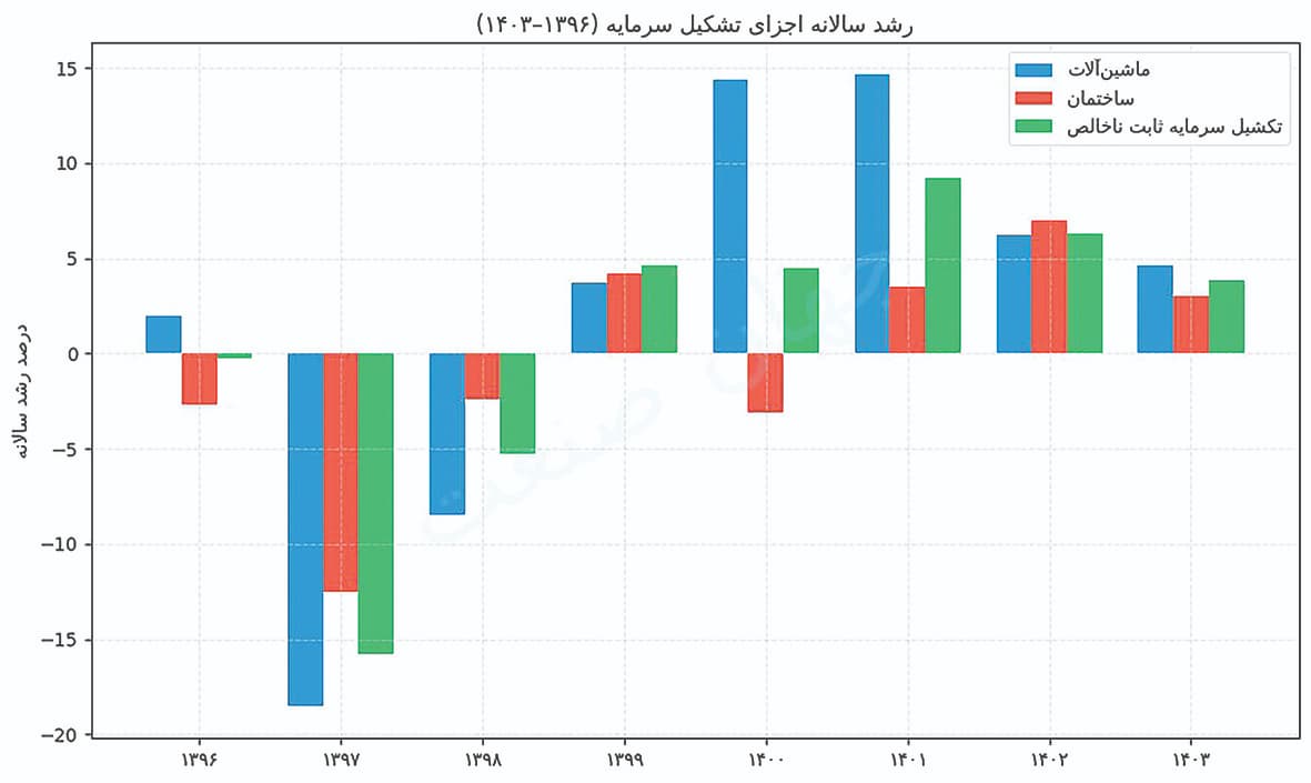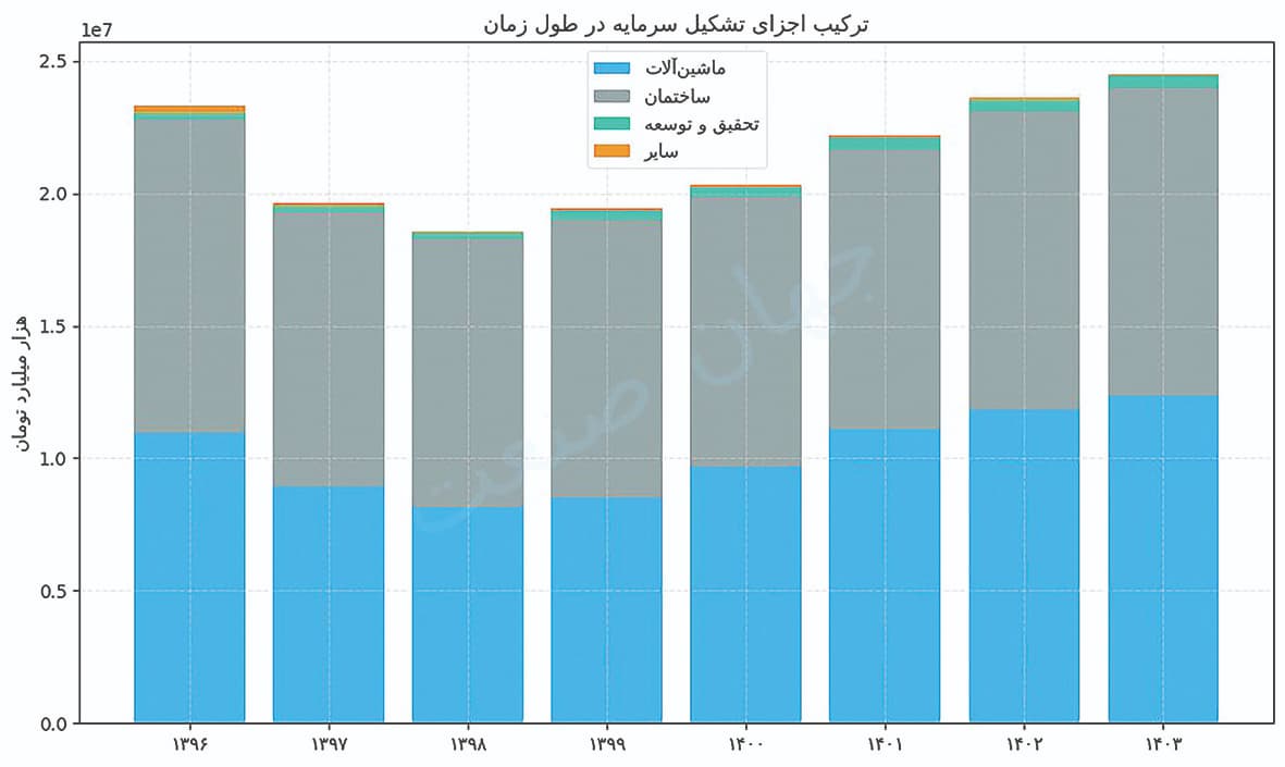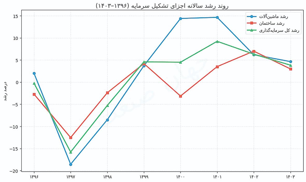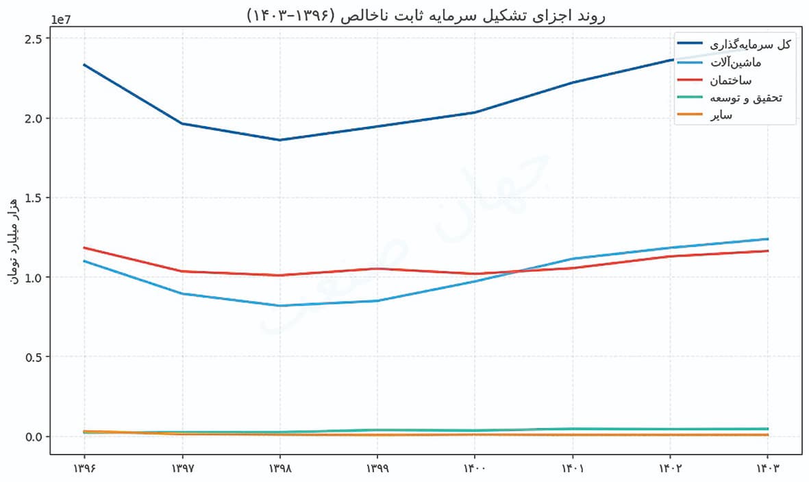 ترکیب اجزای سرمایهگذاری نیز از درون، همین روایت را تایید میکند. دو بخش اصلی، ماشینآلات و ساختمان، در مجموع بیش از ۹۵درصد سرمایهگذاری کل را تشکیل میدهند اما مسیرشان متزلزل بوده است. سرمایهگذاری در ماشینآلات از ۱۰۹۰هزارمیلیارد تومان در سال۱۳۹۶ به حدود ۱۲۳۵هزارمیلیارد تومان در۱۴۰۳ رسیده؛ رشد اسمیای که در ظاهر مثبت است اما در واقع فقط بخشی از افتهای عمیق سالهای ۱۳۹۷ و ۱۳۹۸ را جبران کرده است. در آن سالها همزمان با خروج آمریکا از برجام و بازگشت تحریمهای بانکی و صنعتی، سرمایهگذاری در ماشینآلات نزدیک به ۲۷درصد سقوط کرد.