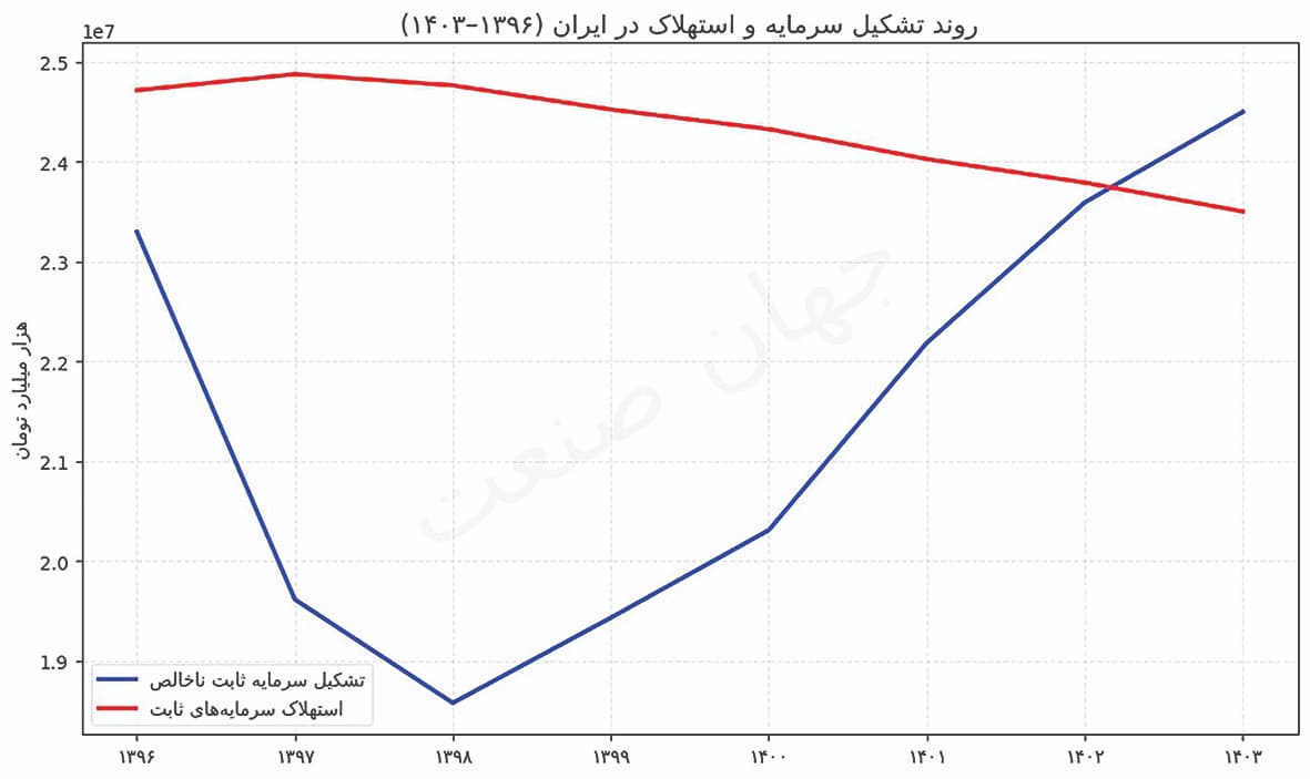 ماشین سرمایهگذاری در ایران سالهاست با سرعتی کُند و ناپایدار حرکت میکند. دادههای رسمی نشان میدهد که «تشکیل سرمایه ثابت ناخالص» از حدود ۲۳۳۰هزارمیلیارد تومان در سال۱۳۹۶ به ۲۴۵۰هزارمیلیارد تومان در سال۱۴۰۳ رسیده است؛ رشدی کمتر از ۲درصد در سال که بهروشنی از ضعف توان انباشت سرمایه حکایت دارد. این رشد اندک در شرایطی رخ داده که طی همین دوره، استهلاک سرمایههای ثابت تقریبا در سطحی مشابه یعنی حدود ۲۳۵۰هزارمیلیارد تومان باقی مانده است؛ بهبیان دیگر بخش عمده سرمایهگذاری کشور صرف جبران فرسودگی داراییهای گذشته شده و سرمایه خالص عملا تکانی نخورده است.