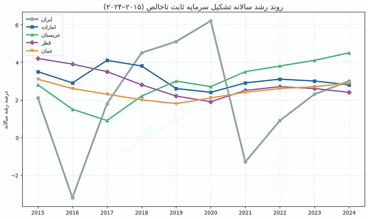 در همین دوره، بسیاری از اقتصادهای کوچکتر منطقه از مسیر دیگری رفتهاند و توانستهاند با اصلاح ساختارها، موتور سرمایهگذاری را به حرکت درآورند. براساس دادههای بانک جهانی، نسبت سرمایهگذاری به تولید ناخالص داخلی در امارات، قطر، عمان و عربستان سعودی در فاصله سالهای ۲۰۱۵ تا ۲۰۲۴ بهطور میانگین از ۲۵درصد به بیش از ۳۰درصد رسیده است درحالیکه میانگین همین شاخص برای ایران در همان بازه زمانی حدود ۳۷درصد بوده اما با افت کیفیت و کاهش اثرگذاری همراه شده است. به بیان روشنتر، کشورهایی که اقتصادشان روزگاری چند برابر کوچکتر از ایران بود، امروز در حال جذب سرمایهگذاریهایی هستند که سهم مستقیمی در تولید، اشتغال و فناوری دارند درحالیکه سرمایهگذاری در ایران بیشتر ماهیت جایگزینی و جبرانی یافته است.
