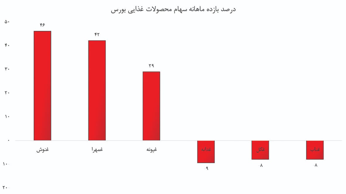 طی یک ماه اخیر سهام شرکت نوش مازندران با نماد غنوش ۲/۴۶+درصد، گروه تولیدی مهرام با نماد غمهرا ۲/۴۲+درصد، نوش پونه مشهد با نماد غپونه ۲۹+درصد، پنبه و دانههای روغنی خراسان با نماد غدانه ۴/۹-درصد، گلوکوزان با نماد غگل ۸-درصد و روغن نباتی ناب با نماد غناب ۹/۷-درصد بازده قیمت را به ثبت رساندند. طی یکسال اخیر نیز سهام شرکت نوش مازندران با نماد غنوش ۲/۲۴-درصد، گروه تولیدی مهرام با نماد غمهرا ۹/۱۱۲+درصد، نوش پونه مشهد با نماد غپونه ۹/۱۳+درصد، پنبه و دانههای روغنی خراسان با نماد غدانه ۲/۱۸۹+درصد، گلوکوزان با نماد غگل ۲/۹۲+درصد و روغن نباتی ناب با نماد غناب ۳/۶-درصد رشد قیمت را تجربه کردند.