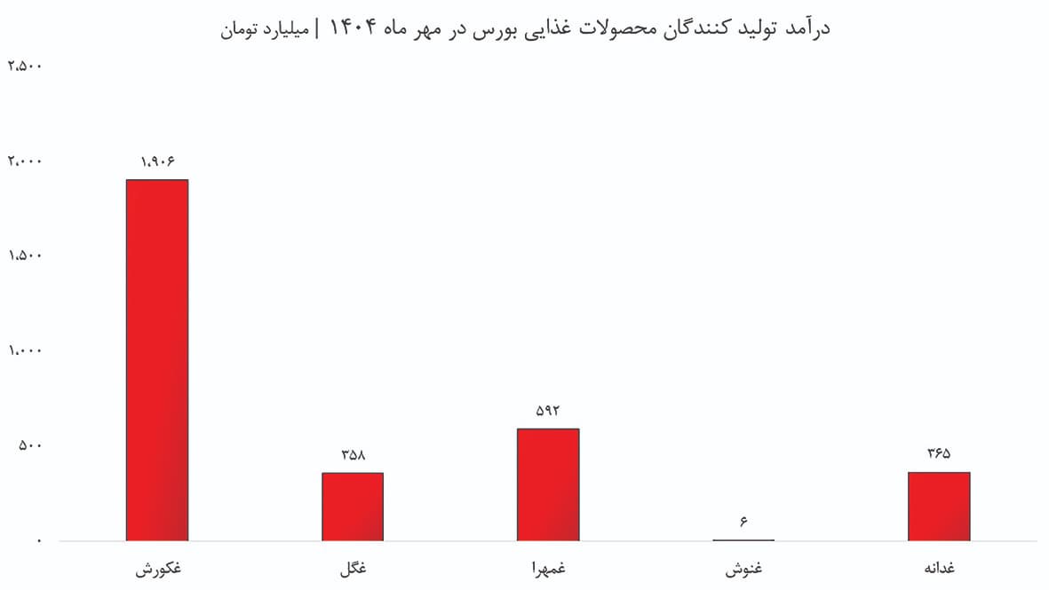 براساس گزارشهای مهرماه۱۴۰۴ شرکت صنعت غذایی کورش ۱۹۰۶میلیاردتومان، گلوکوزان ۳۵۸میلیاردتومان، گروه تولیدی مهرام ۵۹۲میلیاردتومان، نوش مازندران ۵/۵میلیاردتومان و پنبه و دانههای روغنی خراسان ۳۶۵میلیاردتومان فروش را به ثبت رساندند. ناگفته نماند که شرکت نوش مازندران با نماد غنوش پربازدهترین و پنبه و دانههای روغنی خراسان با نماد غدانه کمبازدهترین سهام غذایی بورس در یکماه اخیر بهحساب میآیند و به همین دلیل فروش آنها نیز در لیست مورد توجههای صنعت قرارگرفته است. صنعت غذایی کورش ۹/۷-درصد، گلوگوزان ۶/۳۱+درصد، گروه تولیدی مهرام ۶۰+درصد، نوش مازندران ۰درصد و پنبه و دانههای روغنی خراسان ۴/۱۰۷+درصد تغییر درآمد را نسبت به مدت مشابه سال قبل تجربه کردند.