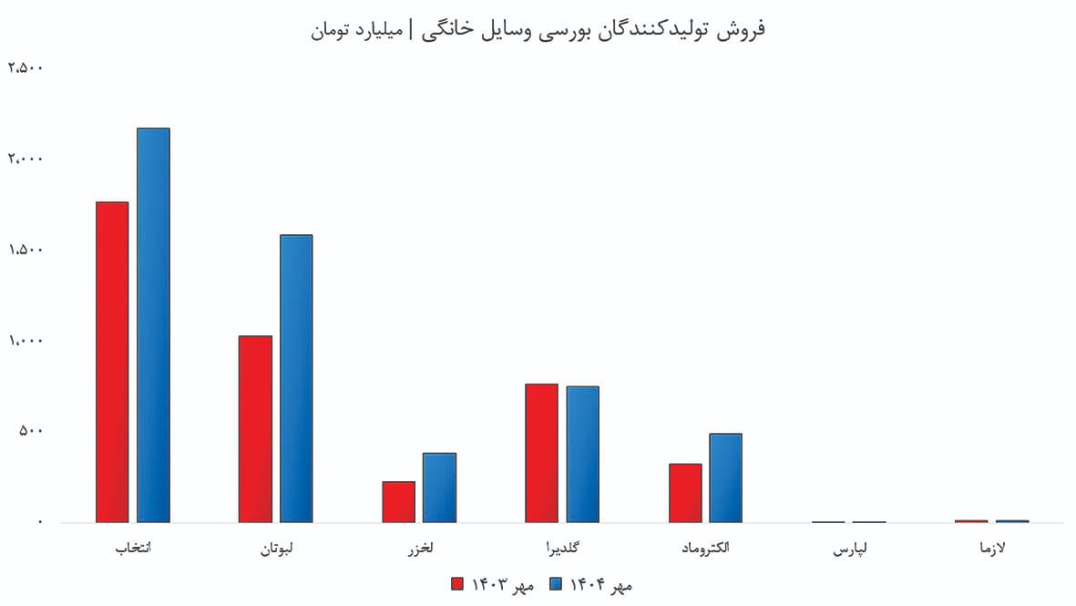 براساس گزارش‌های مهر‌ماه۱۴۰۴ گروه صنعتی انتخاب الکترونیک آرمان ۲‌هزارو۱۷۴‌میلیاردتومان، گروه صنعتی بوتان هزارو۵۸۴‌میلیاردتومان، صنعتی پارس خزر ۳۸۱‌میلیاردتومان، صنایع گلدیران ۷۴۸‌میلیاردتومان، صنایع الکترونیک مادیران ۴۸۸‌میلیاردتومان، کارخانجات پارس الکتریک ۳۰۰‌میلیونتومان، کارخانه‌های صنعتی آزمایش ۹/۱۱‌میلیاردتومان فروش را به ثبت رساندند.