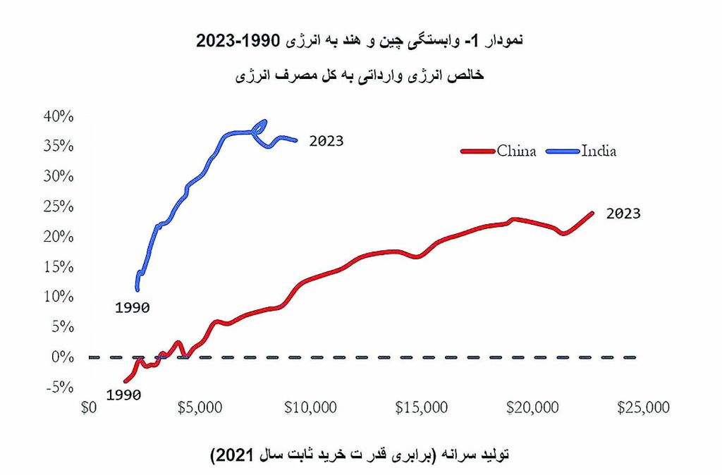 اگر به واردات انرژی به‌عنوان سهمی از کل مصرف انرژی هند و چین در طول تاریخ اقتصادی اخیرشان نگاه کنیم (نمودار ۱)، می‌بینیم که هند نه‌تنها به شدت به انرژی وارداتی وابسته است، بلکه وابستگی آن از ۱۰درصد مصرف انرژی در سال‌۱۹۹۰ به بیش از ۳۵درصد در سال‌۲۰۲۳ افزایش یافته است. در مقایسه چین نیز به انرژی وارداتی وابسته بوده اما در نقاط مشابه از توسعه‌اش، وابستگی کمتری نسبت به هند داشته است.