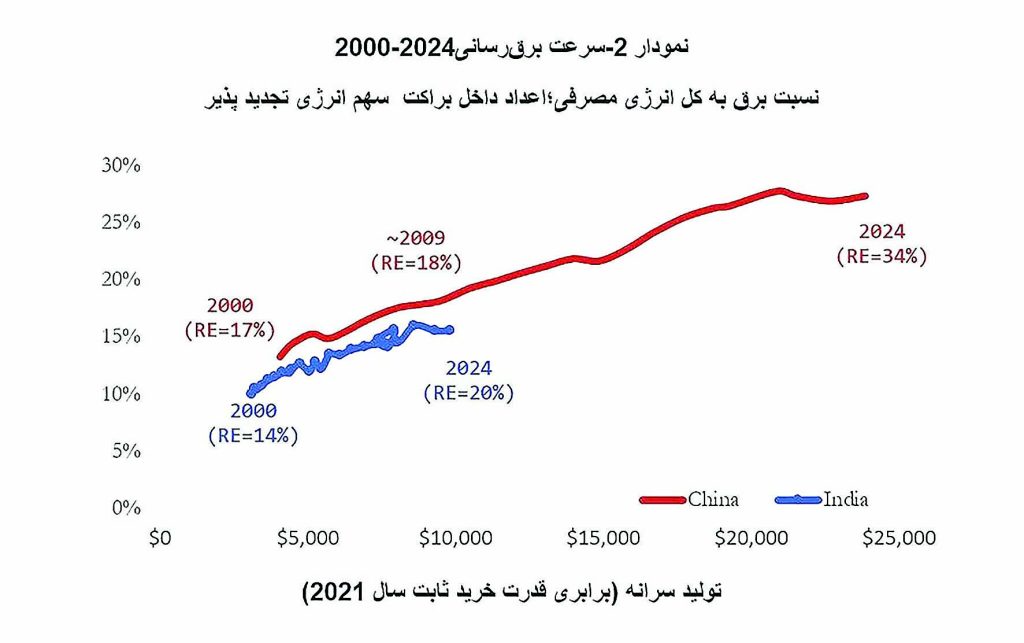 با توجه به اینکه برق ۶/۱۵درصد از کل مصرف انرژی هند را تشکیل می‌دهد (نمودار ۲)، سهم برق در هند کمتر از آنچه در چین در سطح مشابهی از توسعه در سال‌۲۰۰۹ بوده است، و به‌طور قابل‌توجهی کمتر از جایی که چین امروز در آن قرار دارد (۴/۲۷درصد) است. به‌طور مشابه، سهم انرژی‌های تجدیدپذیر در چین بالاتر است، به‌طوری‌ که این سهم در چین ۳۵درصد و در هند ۲۰درصد است. بنابراین، هند تاکنون در تلاش خود برای دستیابی به استقلال انرژی از چین عقب‌تر است.
