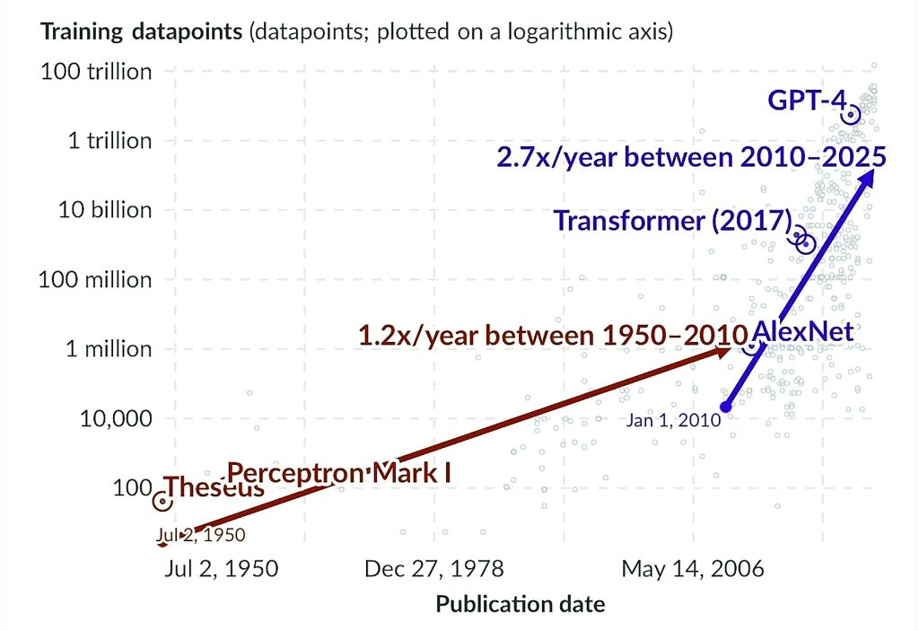یکی از روشهای نگاه به مدلهای هوشمصنوعی امروزی این است که آنها را سیستمهای تشخیص الگو بسیار پیشرفته در نظر بگیریم. این مدلها با شناسایی و یادگیری از قاعدههای آماری موجود در متن، تصاویر یا سایر دادههایی که روی آنها آموزش دیدند عمل میکنند. هرچه مدل به دادههای بیشتری دسترسی داشته باشد میتواند جزئیات و پیچیدگیهای حوزه دانش که برای آن طراحی شده را بهتر یاد بگیرد. در سال۱۹۵۰ کلود شانون یکی از نخستین نمونههای هوشمصنوعی را ساخت: موش رباتیک تزیوس که میتوانست مسیر خود در یکهزارتو را با استفاده از مدارهای رله ساده به خاطر بسپارد. هر دیواری که تزیوس به آن برخورد میکرد به یک نقطه داده تبدیل میشد و به موش اجازه میداد مسیر صحیح را یاد بگیرد. تعداد کل دیوارها یا نقاط داده۴۰ بود. این داده را میتوان در نمودار۱ مشاهده کرد و اولین نقطه آن مربوط به تزیوس است. درحالیکه تزیوس تنها وضعیتهای دودویی ساده را در مدارهای رله ذخیره میکرد سیستمهای مدرن هوشمصنوعی از شبکههای عصبی گسترده استفاده میکنند که میتوانند الگوها و روابط بسیار پیچیدهتری را آموخته و به این ترتیب میلیاردها نقطه داده را پردازش کنند. تمام مدلهای برجسته اخیر بهویژه مدلهای بزرگ و پیشرفته بر مقدار عظیمی از دادههای آموزشی متکی هستند. باتوجهبه محور عمودی که در مقیاس لگاریتمی نمایش داده شده نمودار۱ نشان میدهد که دادههای مورد استفاده برای آموزش مدلهای هوشمصنوعی بهشکل نمایی رشد کردند. از ۴۰نقطه داده برای تزیوس تا تریلیونهانقطه داده برای بزرگترین سیستمهای مدرن در مدت کمی بیش از هفتدهه. از سال۲۰۱۰ حجم دادههای آموزشی تقریبا هر ۹تا۱۰ماه دوبرابر شده است. این رشد سریع را میتوان در نمودار مشاهده کرد که با خط بنفش از ابتدای۲۰۱۰ تا اکتبر۲۰۲۴ (آخرین نقطه داده هنگام نگارش مقاله) نشان داده شده است. مجموعه دادههای مورد استفاده برای آموزش مدلهای بزرگ زبان بهویژه رشد سریعتری داشته و از سال۲۰۱۰ هر سال تقریبا سهبرابر شدند. مدلهای بزرگ زبان متن را با شکستن به توکنها واحدهای پایهای که مدل میتواند رمزگذاری و درک کند، پردازش میکنند. یک توکن مستقیما معادل یک کلمه نیست اما بهطور متوسط سهکلمه انگلیسی تقریبا معادل چهارتوکن است. مدلGPT-2 که در سال۲۰۱۹ عرضه شد براساس برآوردها روی ۴میلیارد توکن آموزش دیده که تقریبا معادل ۳میلیارد کلمه است. برای مقایسه در سپتامبر۲۰۲۴ ویکیپدیای انگلیسی حدود ۶/۴میلیارد کلمه داشت. در مقایسه GPT-4 که در سال۲۰۲۳ منتشر شد تقریبا روی ۱۳تریلیونتوکن یا حدود ۷۵/۹تریلیون کلمه آموزش دیده است. این بدان معناست که حجم دادههای آموزشی GPT-4 بیش از ۲هزاربرابر متن کل ویکیپدیای انگلیسی بوده است. با استفاده از دادههای بیشتر برای آموزش مدلهای هوشمصنوعی ممکن است درنهایت با کمبود مواد با کیفیت تولیدشده توسط انسان مانند کتابها، مقالات و پژوهشها مواجه شویم. برخی پژوهشگران پیشبینی میکنند که ممکن است طی چند دهه آینده منابع آموزشی مفید به پایان برسند. درحالی که خود مدلهای هوشمصنوعی میتوانند دادههای زیادی تولید کنند آموزش مدلها با مواد تولیدشده توسط ماشین میتواند مشکلاتی ایجاد کرده و باعث کمدقتتر و تکراریترشدن مدلها شوند.