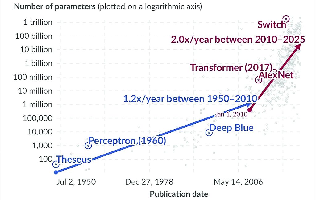 نمودار ۲.رشد نمایی تعداد پارامترها در سیستمهای مهم هوشمصنوعی