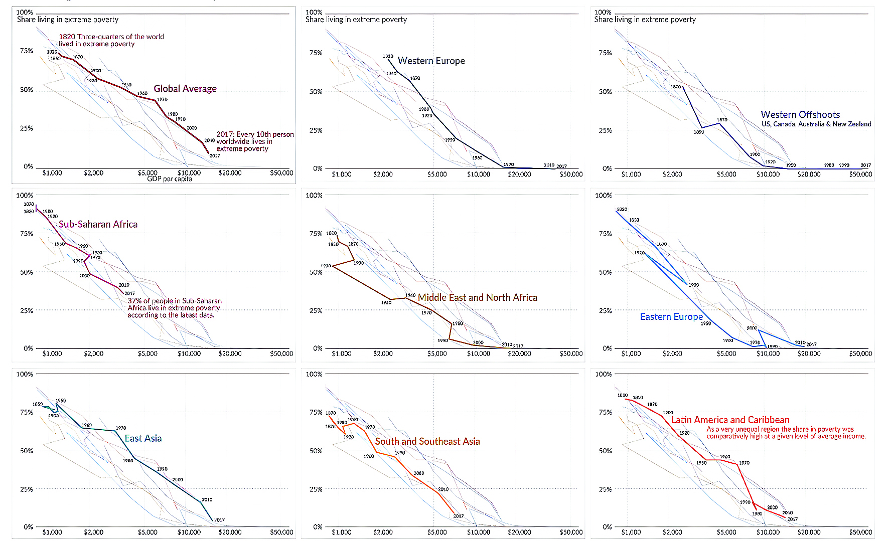 در پنل بالا سمت چپ شکل۱۱ میتوانید ببینید که چگونه فقر جهانی کاهش یافته درحالی که درآمدها افزایش یافتهاند. در دیگر هشت پنل این روند را برای همه مناطق جهان بهطور جداگانه مشاهده میکنید. نقطه آغاز هر مسیر نشاندهنده دادههای سال۱۸۲۰ است و به ما میگوید که دو قرن پیش اکثریت مردم بیتوجه به اینکه در کجای جهان خانه داشتند با فقر شدید زندگی میکردند. در آن زمان بسیاری بر این باور بودند که فقر گسترده اجتنابناپذیر است اما این امر اشتباه ازآب درآمد. این مسیرها نشان میدهند که چگونه درآمدها و فقر درهر منطقه جهان تغییر کرده است. همه مناطق رشد را تجربه کردند(تولید و کیفیت کالاها و خدماتی که مردم به آن نیاز دارند افزایش پیدا کرده) و سهم افرادی که در فقر شدید زندگی میکنند کاهش یافته است.