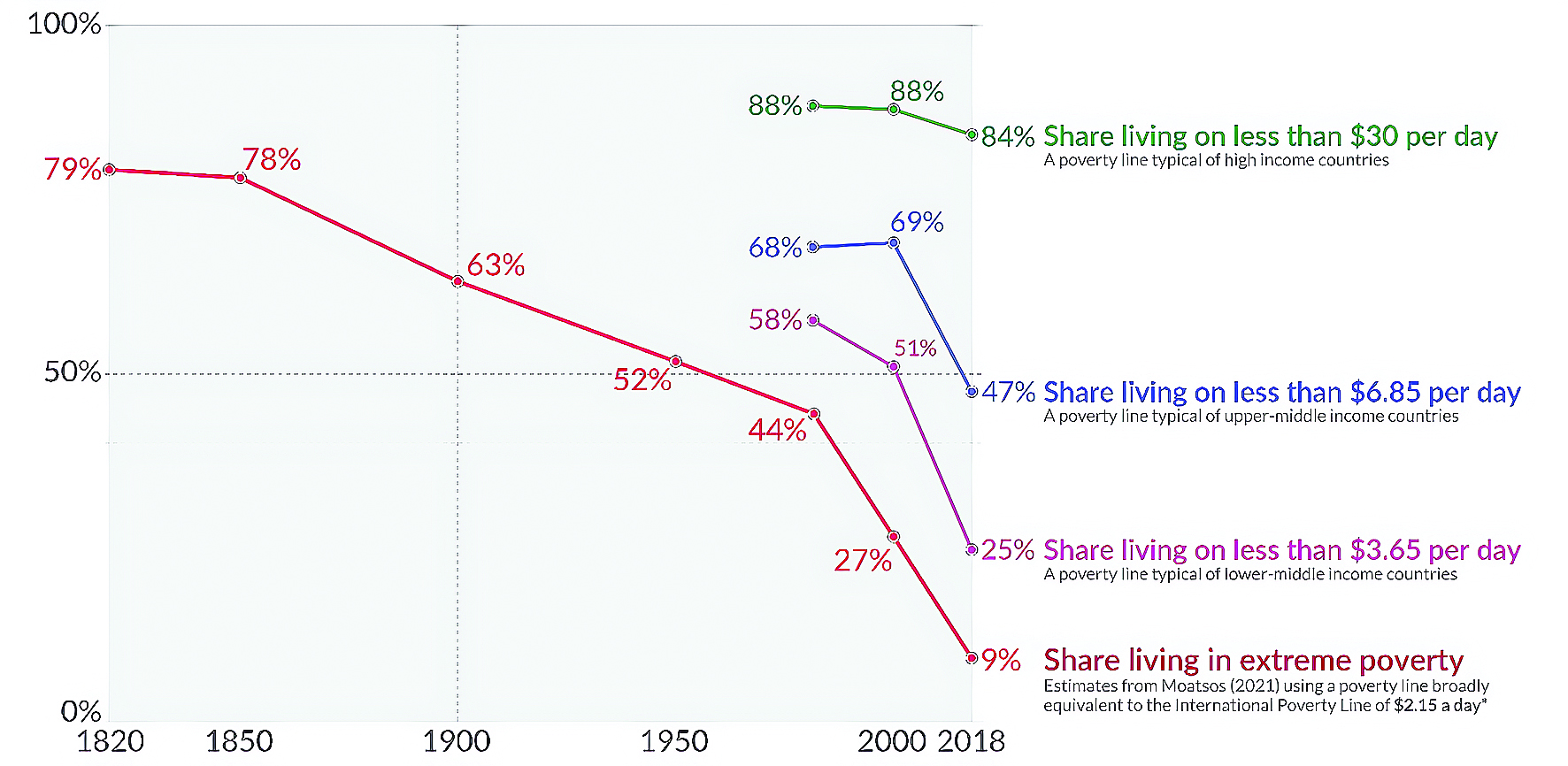 منبع :دادههای تاریخی از میشائل موتسوس(۲۰۲۱)؛ فقر شدید جهانی: گذشته و حال از سال۱۸۲۰. این دادهها درصد افرادی را نشان میدهند که روزانه کمتر از ۱٫۹۰دلار(سال۲۰۱۱) زندگی میکردند. سهخط فقر بالاتر از دادههای پلتفرم فقر و نابرابری بانک جهانی اندازهگیریشده با قیمتهای۲۰۱۷. همه سریها بهصورت میانگین متحرک پنجساله نمایش داده شدند.