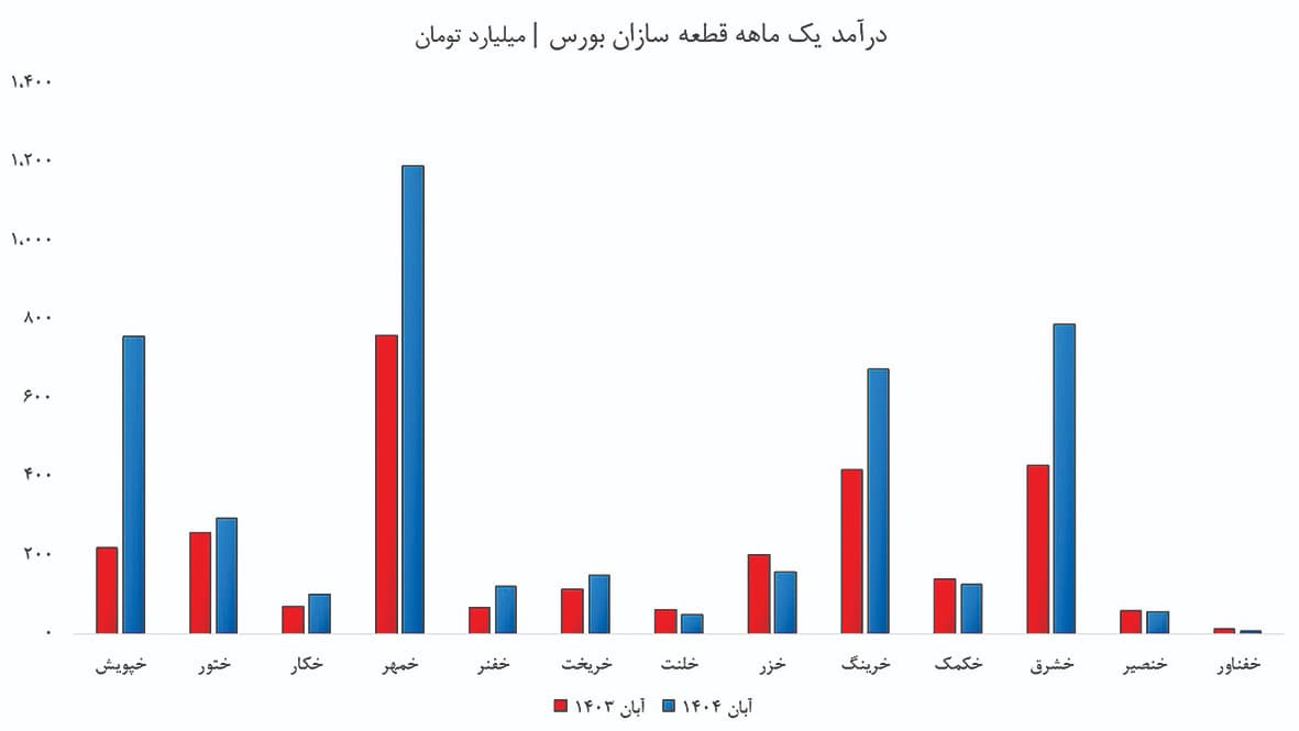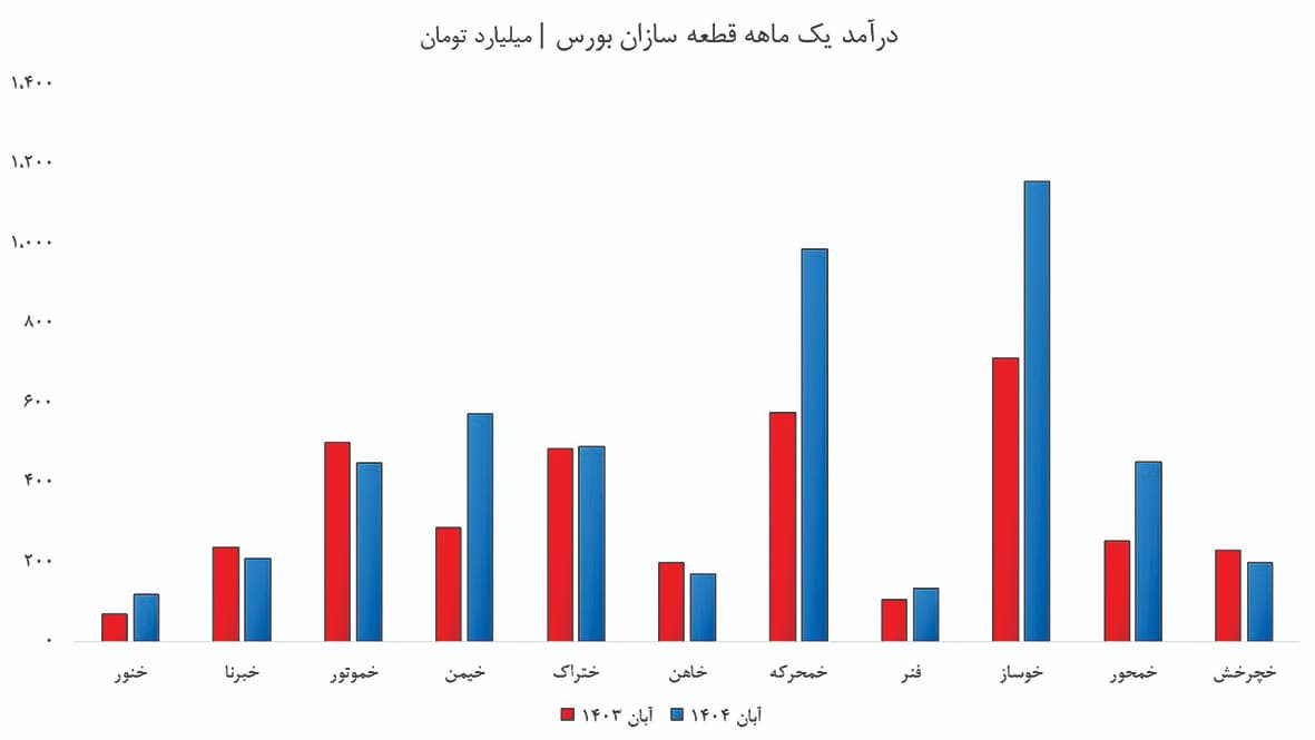 در آبان‌ماه۱۴۰۴ شرکت نور ایستا پلاستیک ۱۱۸میلیارد تومان، تولیدی برنا باتری ۲۱۰‌میلیارد تومان، موتور‌‌سازان تراکتور‌سازی ایران ۴۴۹‌میلیارد تومان، ایمن خودرو شرق ۵۷۲‌میلیارد تومان، ریخته‌گری تراکتور‌سازی ایران ۴۸۹‌میلیارد تومان، آهنگری تراکتور‌سازی ایران ۱۷۰‌میلیارد تومان، صنعتی نیرو محرکه ۹۸۵‌میلیارد تومان، پارس فنر ۱۳۳‌میلیارد تومان، محور‌سازان ۱۱۵۷‌میلیارد تومان، تولید محور خودرو ۴۵۱‌میلیارد تومان، چرخشگر ۱۹۹‌میلیارد تومان، سازه پویش ۷۵۷‌میلیارد تومان، رادیاتور ایران ۲۹۴‌میلیارد تومان، ایرکا پارت صنعت ۱۰۰‌میلیارد تومان، مهرکام پارس ۱۱۹۰ میلیارد تومان، فنرسازی خاور ۱۲۰‌میلیارد تومان، صنایع ریخته‌گری ایران ۱۴۹‌میلیارد تومان، تولیدی لنت ترمز ایران ۴۸‌میلیارد تومان، فنرسازی زر ۱۵۶‌میلیارد تومان، رینگ‌سازی مشهد ۶۷۴ میلیارد تومان، کمک فنر ایندامین سایپا ۱۲۷‌میلیارد تومان، الکتریک خودرو شرق ۷۸۸‌میلیارد تومان، مهندسی نصیر ماشین ۵۷‌میلیارد تومان و مهندسی صنعتی روان فن‌آوران ۶/۷‌میلیارد تومان فروش را به ثبت رساندند.
