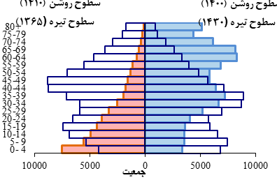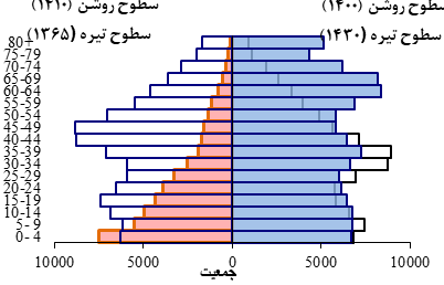 تغییرات ساختار سنی جمعیت ایران از خیلی جوان (۱۶۵)، به شایط انتقالی (۱۴۰۰ و ۱۴۱۰) و ابرسالمندی (۱۴۳۰)