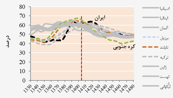 روند تغییرات نسبت جمعیت در سن کار در ایران و کشورهای منتخب، ۱۴۸۰-۱۳۳۰