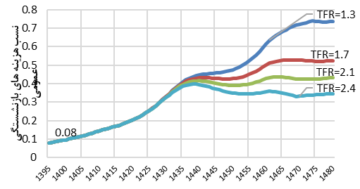 وی در ادامه به نتیجه شبیهسازی اثر سطح باروری بر نظام بازنشستگی اشاره کرد و گفت: کاهش سطح باروری به سطوح خیلی پائین اثر بیشتری بر افزایش هزینههای بازنشستگی عمومی دارد تا اثر مثبت افزایش آن به سطحی بالاتر. به این معنی که موفقیت سیاستهای جمعیتی در حفظ سطح کنونی (حدود ۷۱ فرزند برای هر زن تا سال ۱۴۳۰) هم میتواند از فشار مالی بر نظام بازنشستگی کم کند، اگرچه مسلماً، در صورت تحقق افزایش آن به سطح جانشینی (کمی بیش از ۲ فرزند) کاهش بیشتری در این فشار ایجاد خواهد کرد.