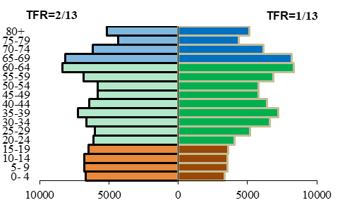 و در صورت کاهش باروری تا ۱.۱۳ (سمت راست) در افق ۱۴۸۰