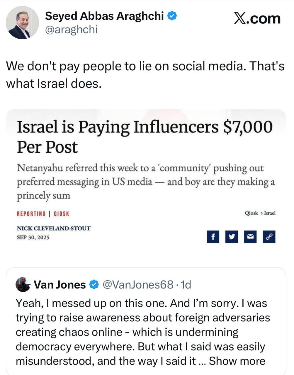 عراقچی با اظهار نظر ذیل پست عذرخواهی ون جونس، با ضمیمه کردن تصویر گزارش اندیشکده کوئینسی نوشت «ما به کسی پول نمیدهیم که در شبکههای اجتماعی دروغ بگوید. این کاری است که اسرائیل انجام میدهد.»