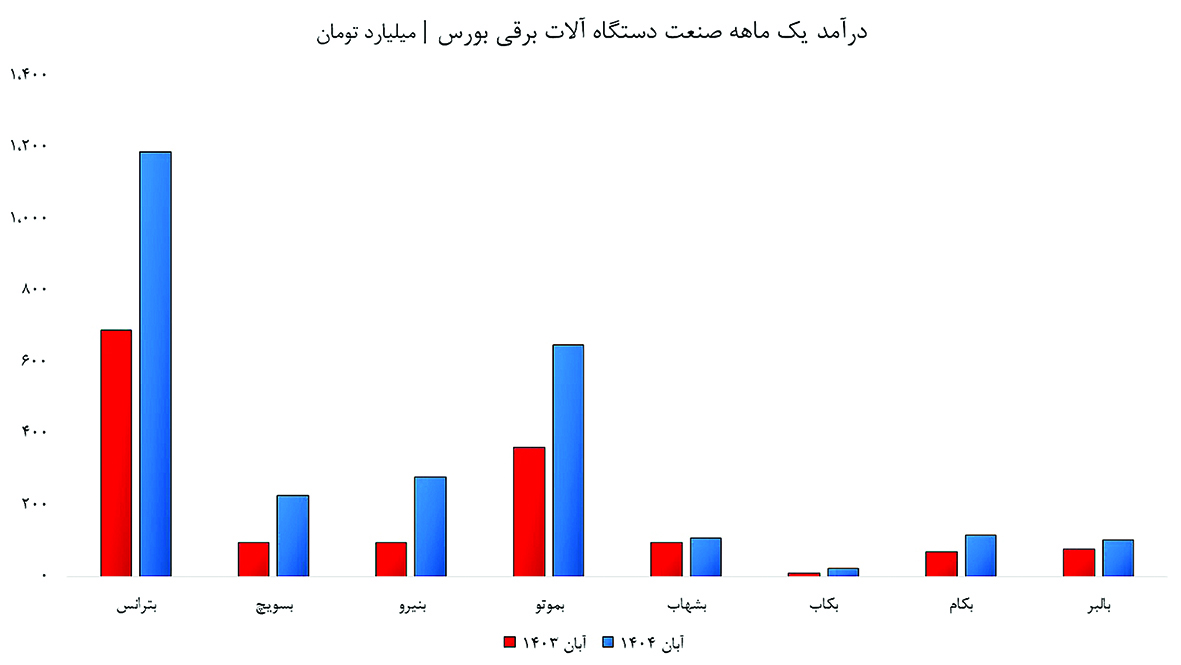 در آبانماه۱۴۰۴ شرکت ایرانترانسفو یکهزار و ۱۸۷میلیارد تومان، پارسسوئیچ ۲۲۷میلیارد تومان، نیرو ترانس ۲۷۹میلیارد تومان، موتوژن ۶۴۸میلیارد تومان، لامپ پارس شهاب ۱۰۸میلیارد تومان، جوشکاب یزد ۲۲میلیارد تومان، کارخانجات تولیدی شهید قندی ۱۱۷میلیارد تومان، کابل البرز ۱۰۳میلیارد تومان فروش را به ثبت رساندند.
