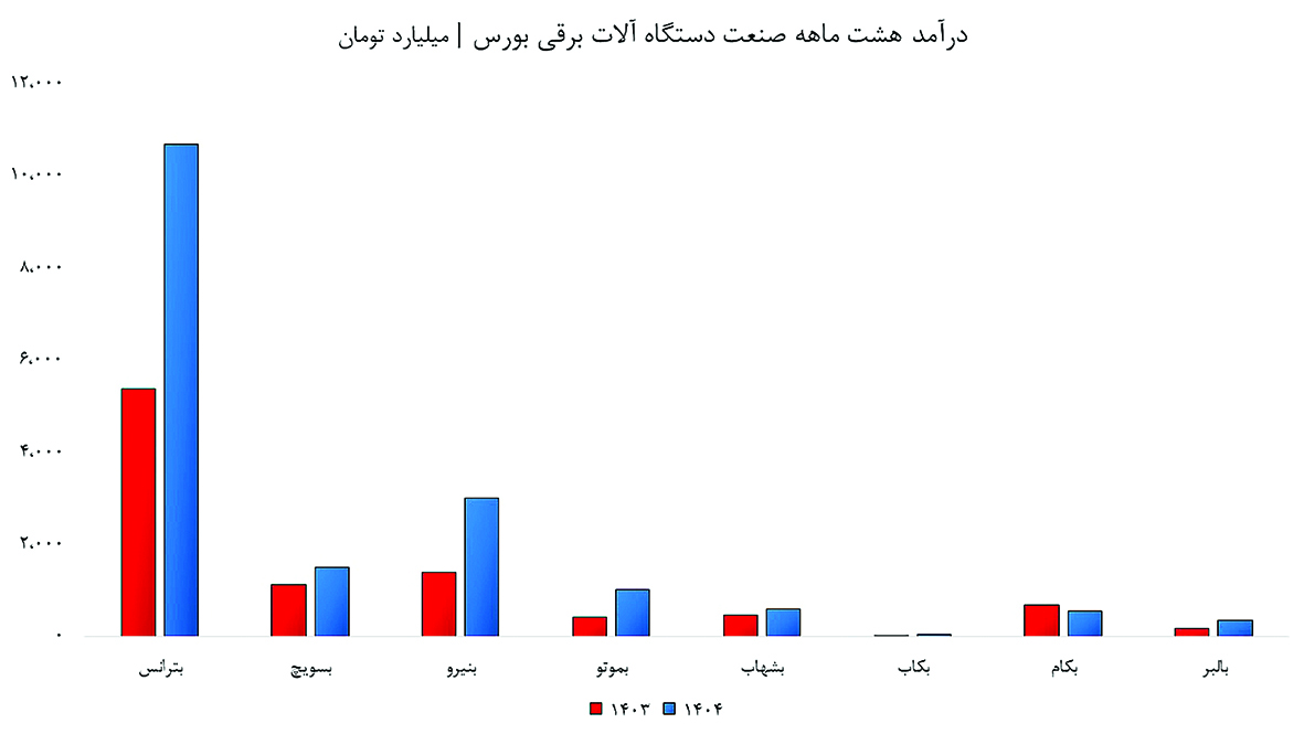 در هشتماهه نخست۱۴۰۴ شرکت ایرانترانسفو ۱۰هزار و ۶۸۹میلیارد تومان، پارسسوئیچ یکهزار و ۵۰۴میلیارد تومان، نیرو ترانس ۳هزار و ۲میلیارد تومان، موتوژن یکهزار و ۱۷میلیارد تومان، لامپ پارس شهاب ۵۸۷میلیارد تومان، جوشکاب یزد ۳۹میلیارد تومان، کارخانجات تولیدی شهید قندی ۵۶۰میلیارد تومان، کابل البرز ۳۴۶میلیارد تومان فروش داشتند.