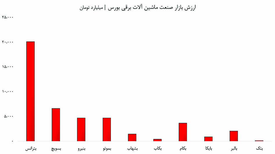 طی یک ماه اخیر سهام شرکت ایران ترانسفو با نماد بترانس ۸/۱۸+درصد، پارس سوییچ با نماد بسویچ ۸/۹+ درصد، نیرو ترانس با نماد بنیرو ۵/۱۵+ درصد، موتوژن با نماد بموتو ۷/۸+درصد، لامپ پارس شهاب با نماد بشهاب ۲/۵+درصد، جوشکاب یزد با نماد بکاب ۹/۱۵+درصد، کارخانجات تولیدی شهید قندی ایران با نماد بکام ۷/۱۹+درصد، کارخانجات کابلسازی ایران با نماد بایکا ۹/۵-درصد، کابل البرز با نماد بالبر ۵/۳۶+درصد و کارخانجات کابلسازی تک با نماد بتک ۷/۸-درصد بازده قیمت را به ثبت رساندند. سهام شرکت کابل البرز با نماد بالبر تاپگینر صنعت در بازه یکماهه محسوب شده که در یک سال اخیر هم با رشد ۸۴ درصدی قیمت در صدر جدول قرار دارد.